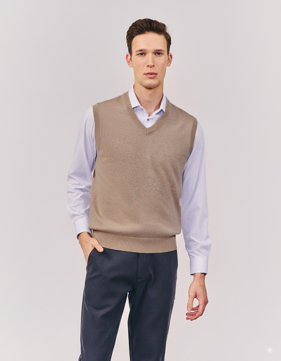 אפודת סריג בייסיק, ללא שרוולים, צווארון V, בצבע קאמל. הרכב בד: 100% כותנה. מידת דוגמן: M גובה 1.80.