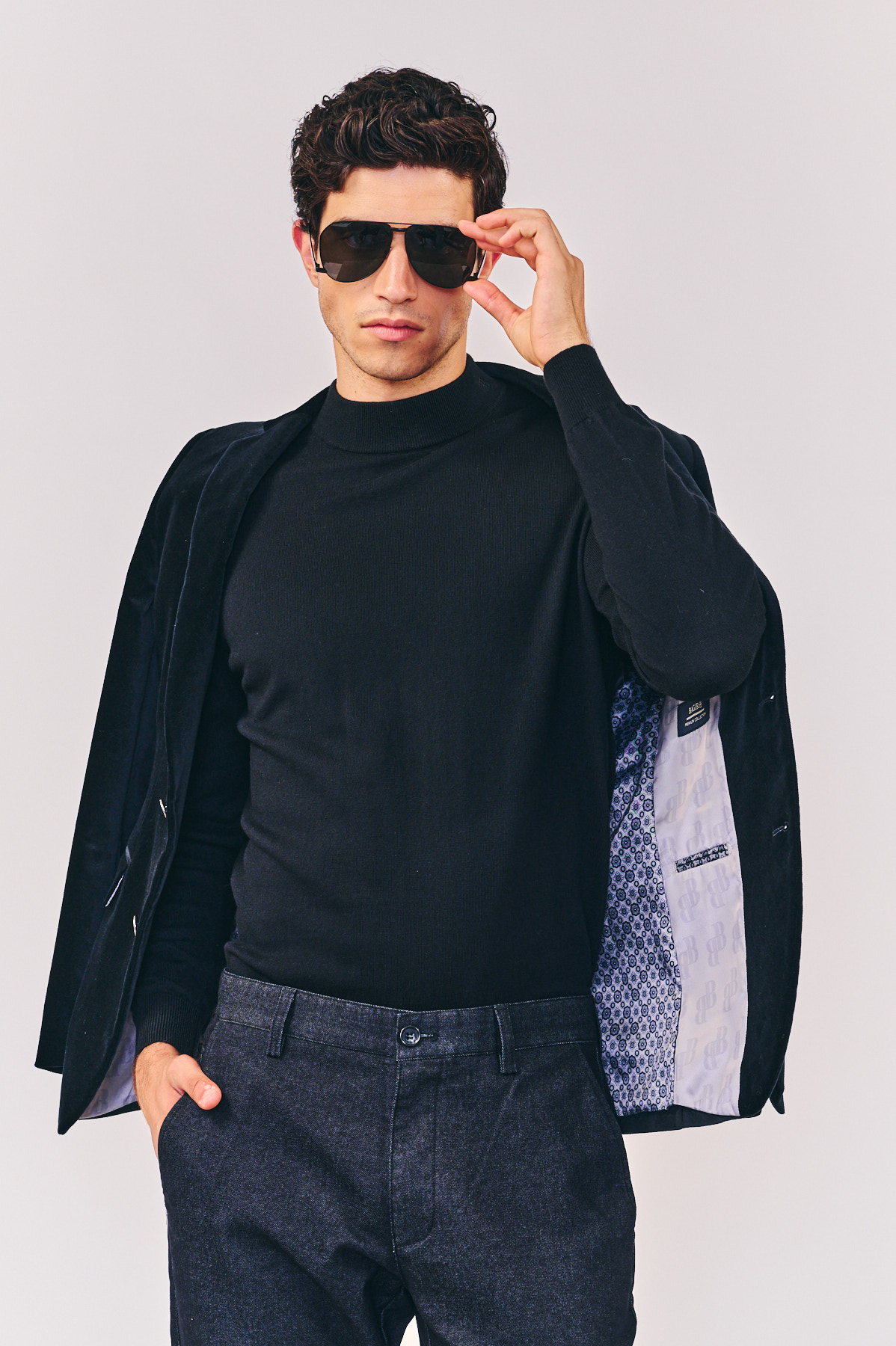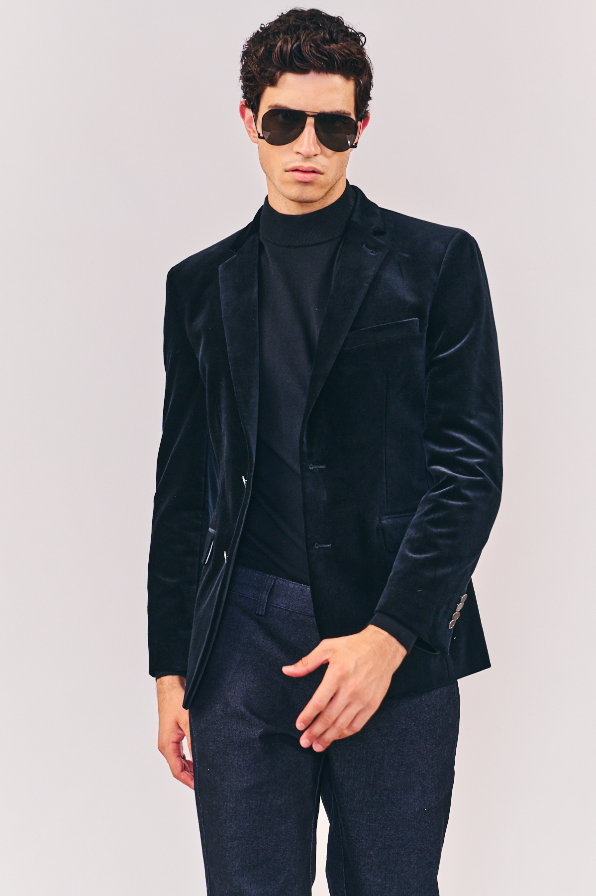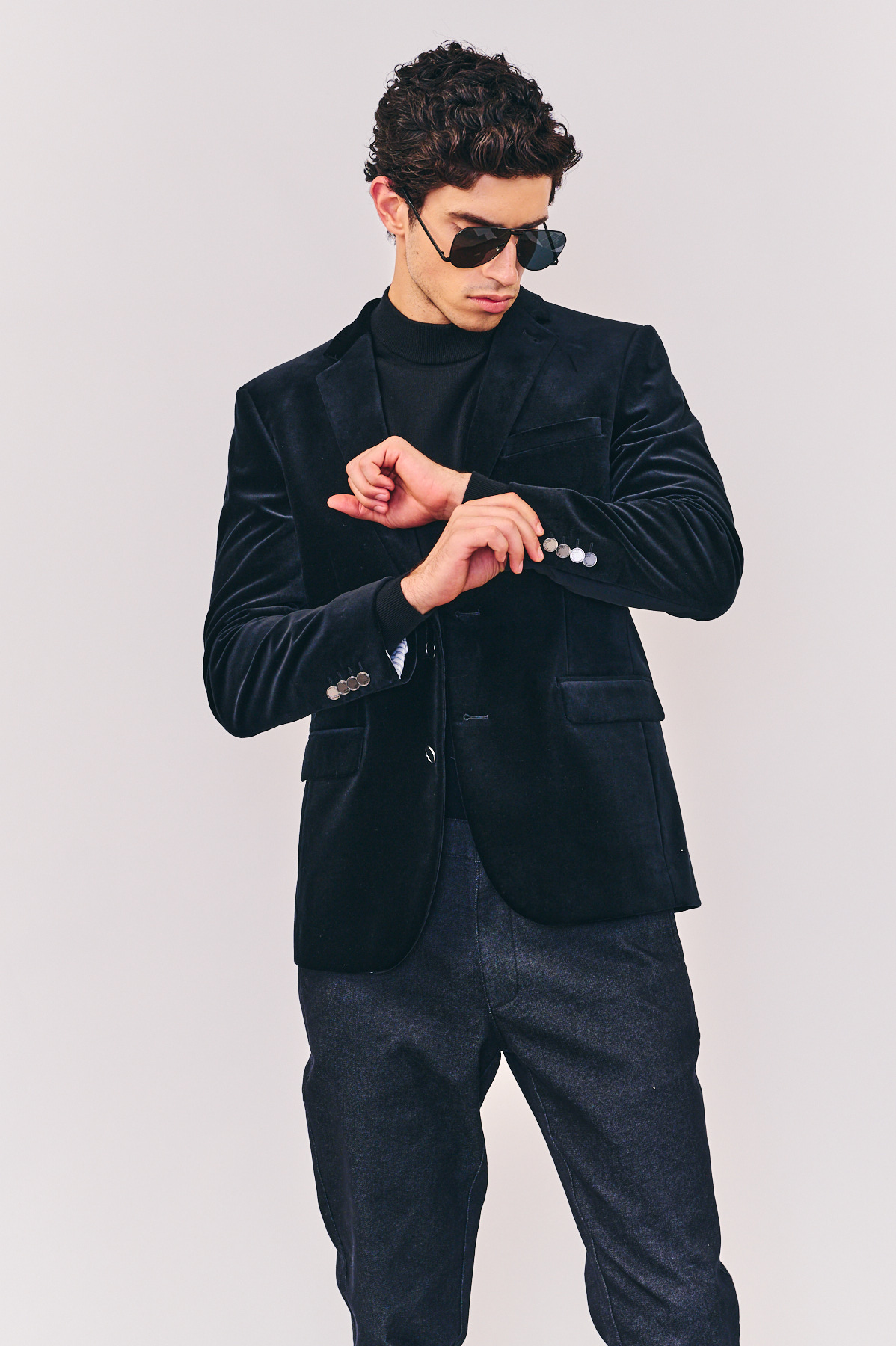 בלייזר קטיפה בגזרת Slim, עשוי תערובת כותנה וספנדקס בצבע שחור.