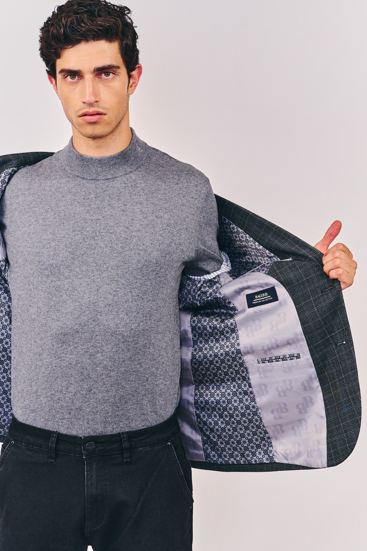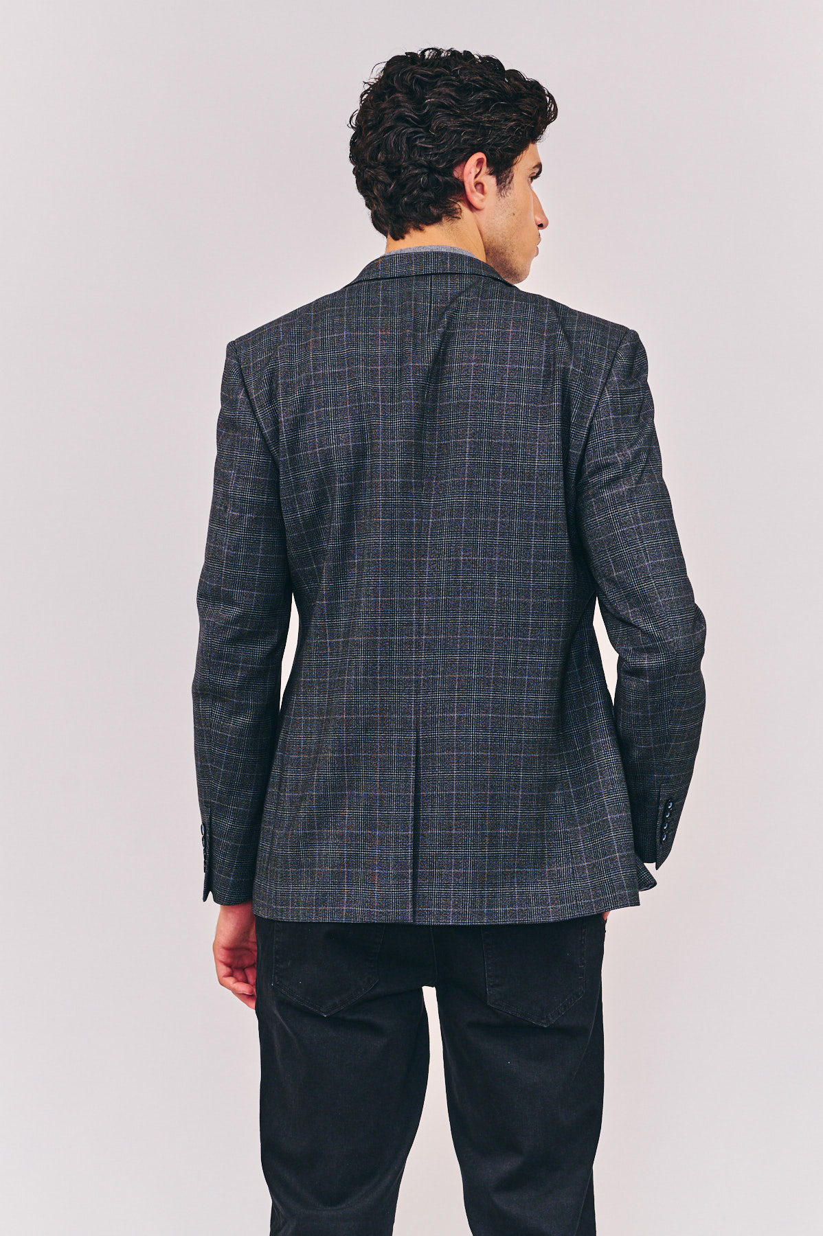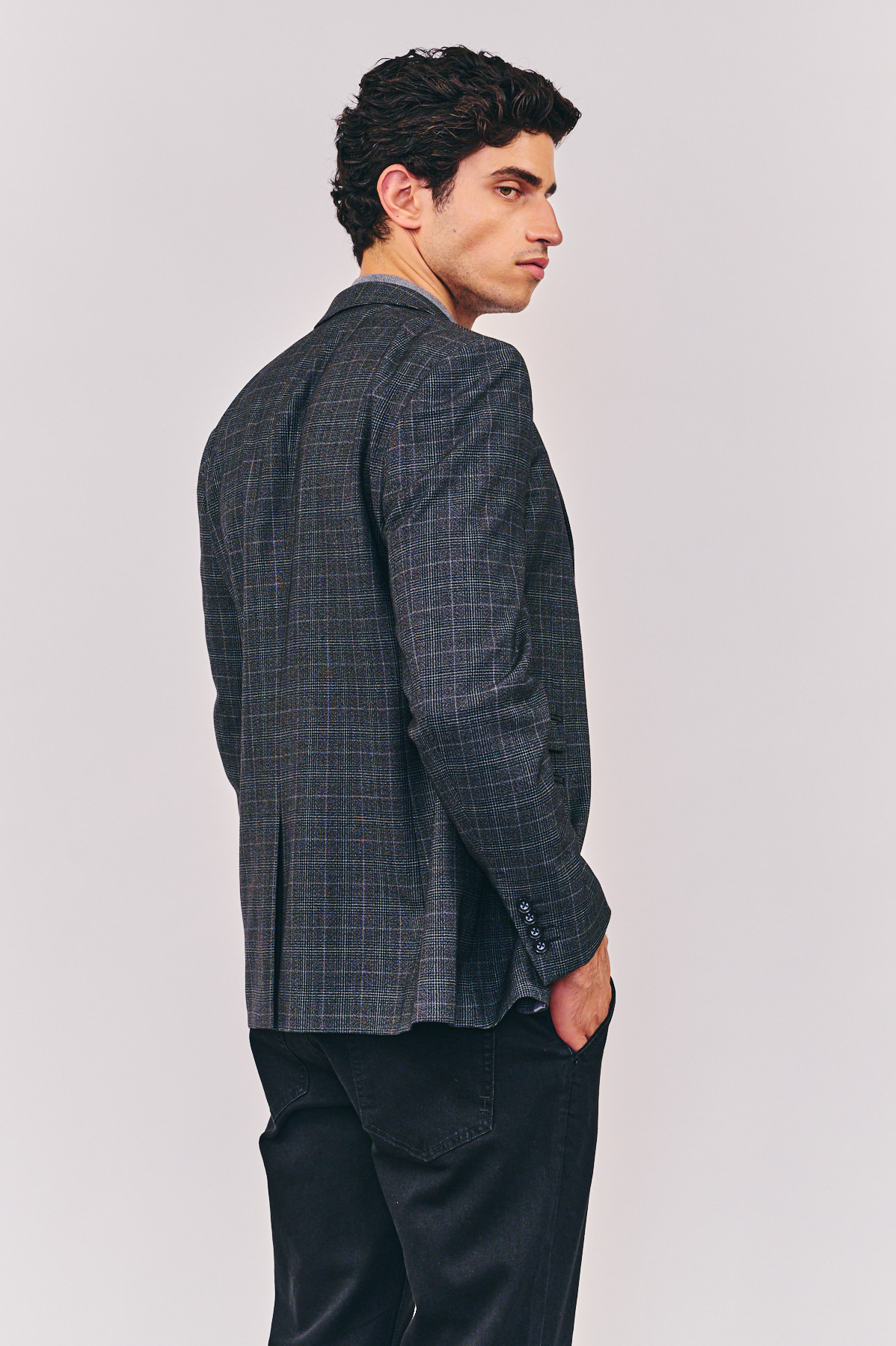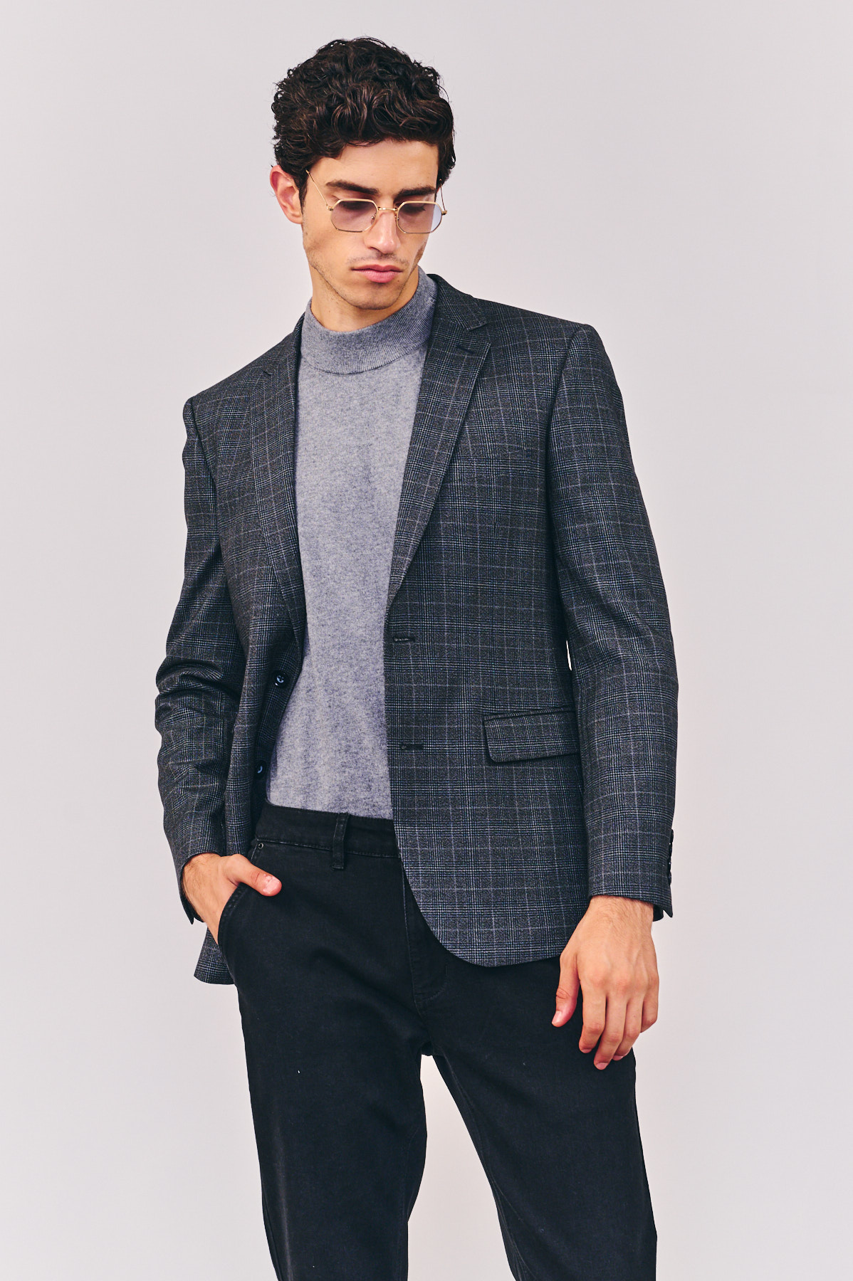בלייזר אופנתי בגזרת Slim, עשוי תערובת פוליאסטר, ויסקוזה וספנדקס בצבע אפור משובץ.