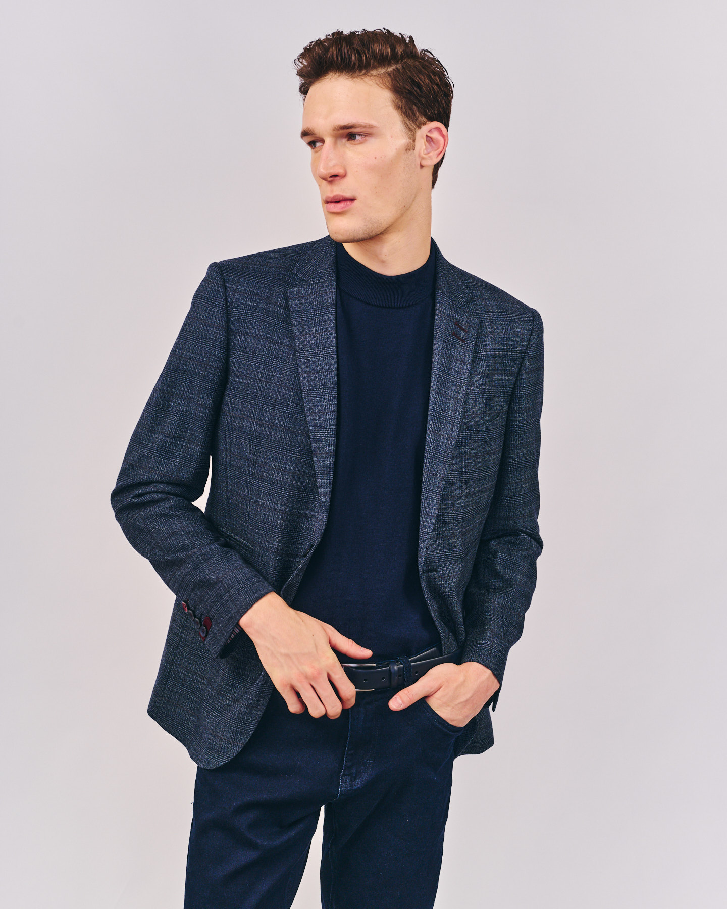 בלייזר אופנתי בגזרת Slim, עשוי תערובת פוליאסטר, ויסקוזה וספנדקס בצבע נייבי משובץ.