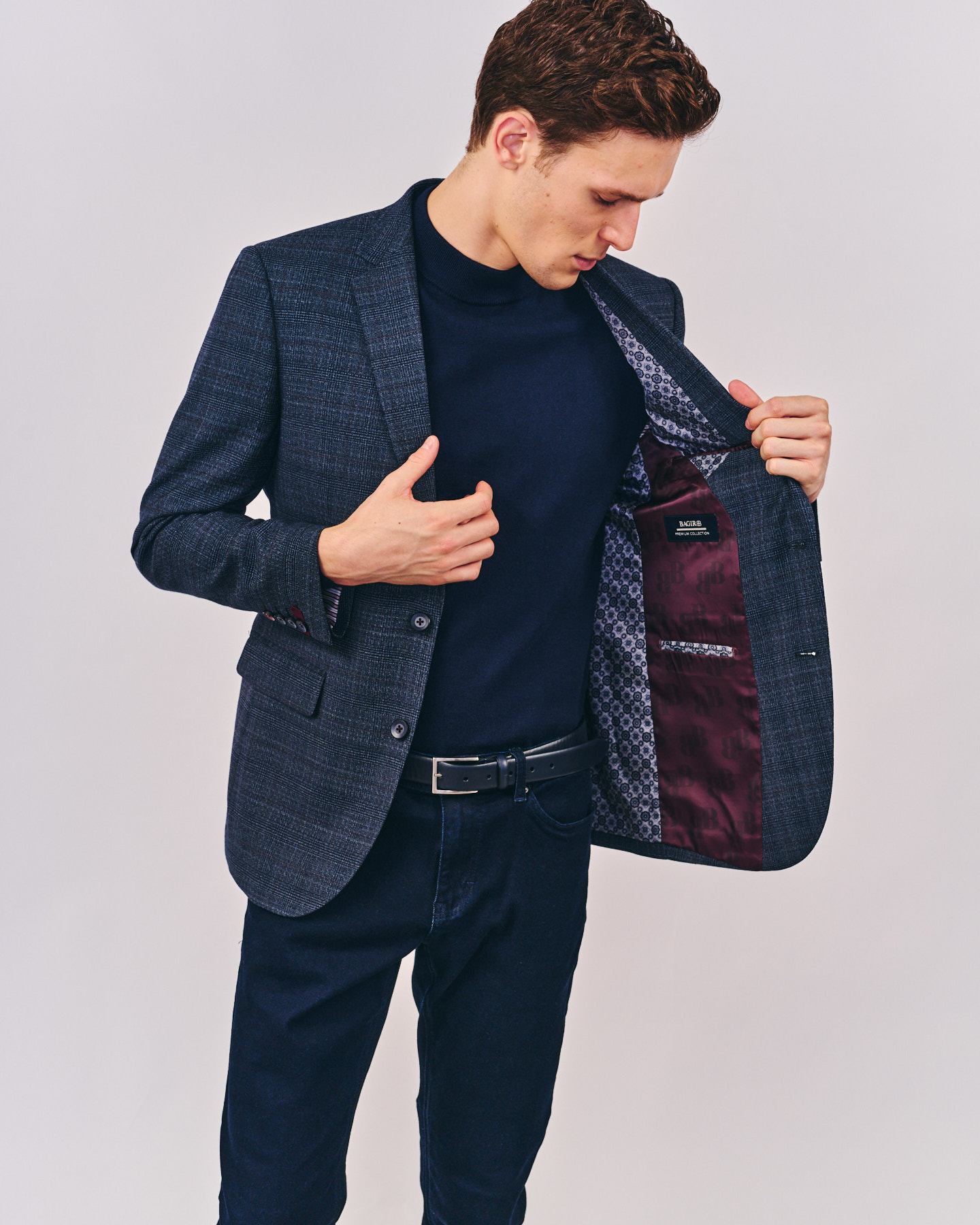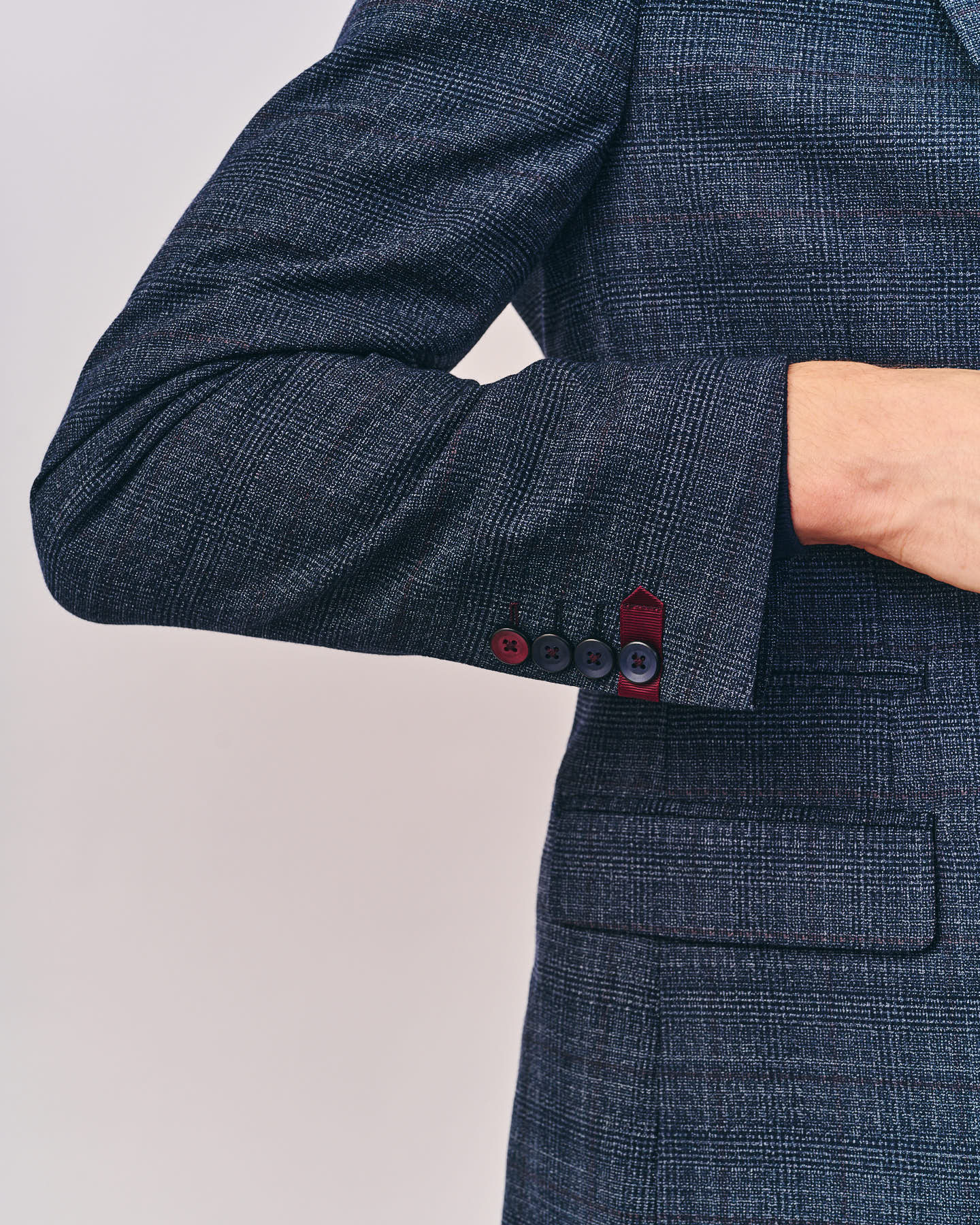 צווארון דש רגיל עם שתי לולאות דש, שני כפתורים בחזית, כיס חזה, שני כיסי צד וכיס קטן נוסף. שרוולים עם לולאות מעוצבות בחפתים,שסע אחורי במרכז.