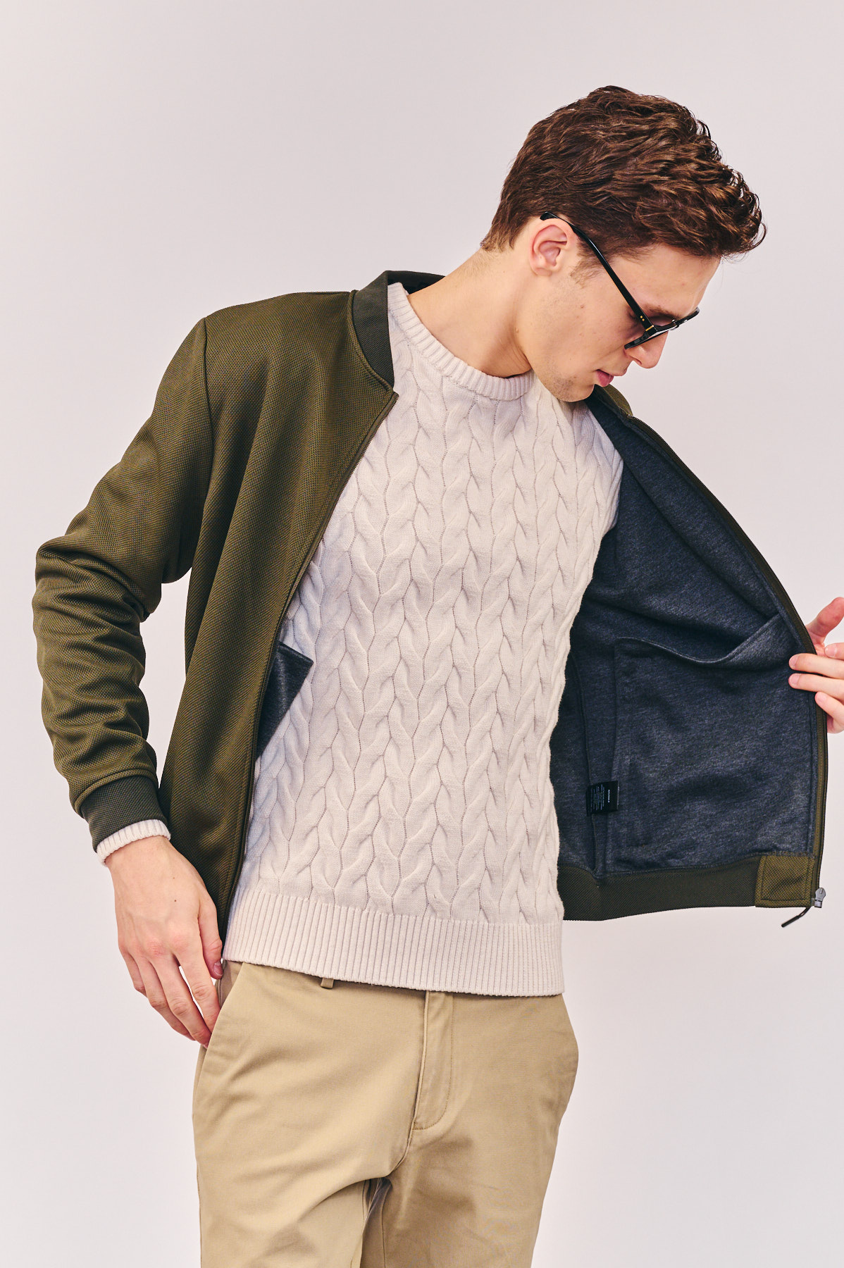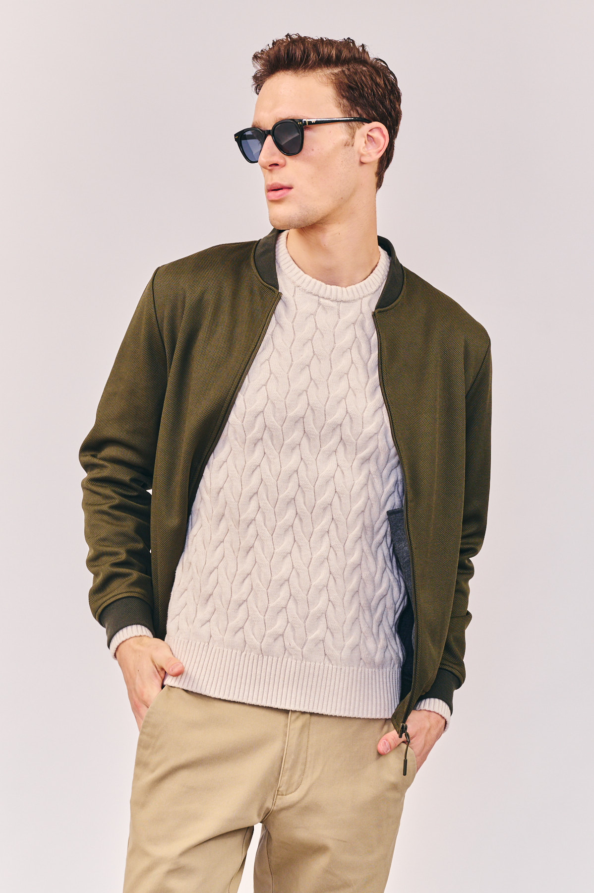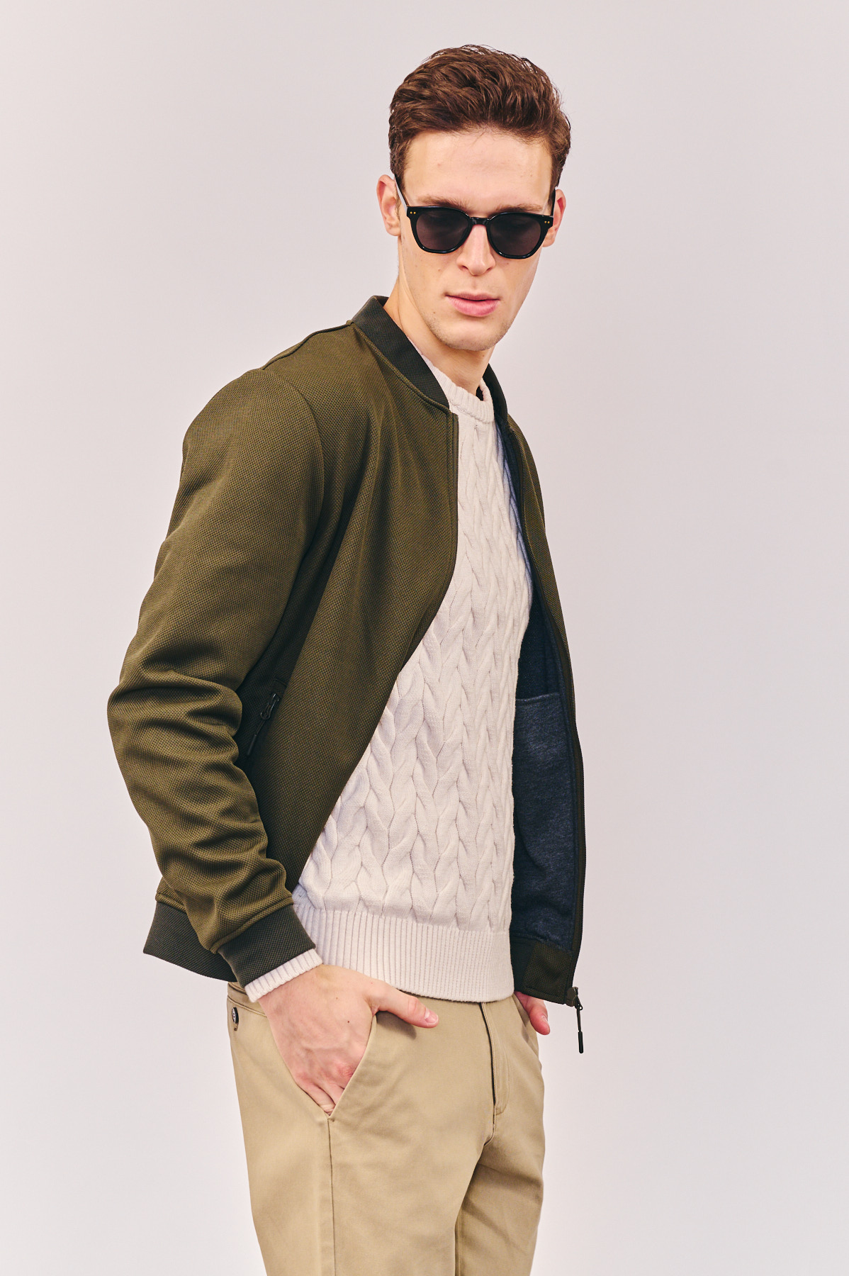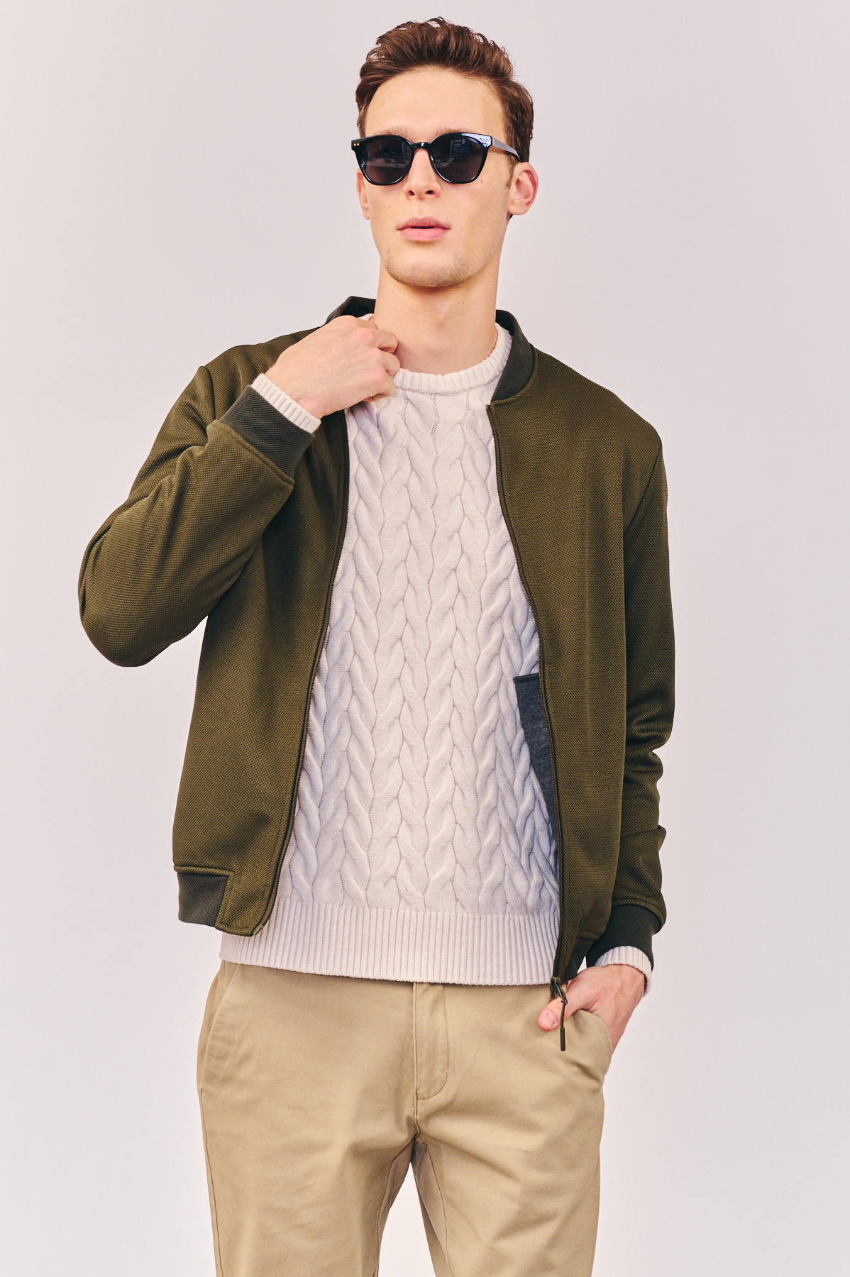 ג’קט קל בצבע ירוק עם רוכסן וכיסי רוכסן, מכפלת ריב אלסטית וצווארון בייסבול ריב נמוך. פנים הג’קט עשוי בד ג’רזי אלסטי לנוחות מירבית