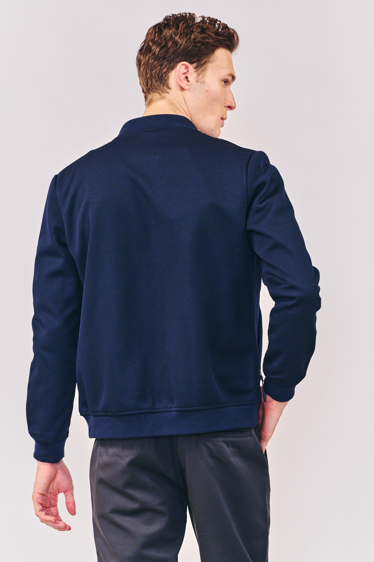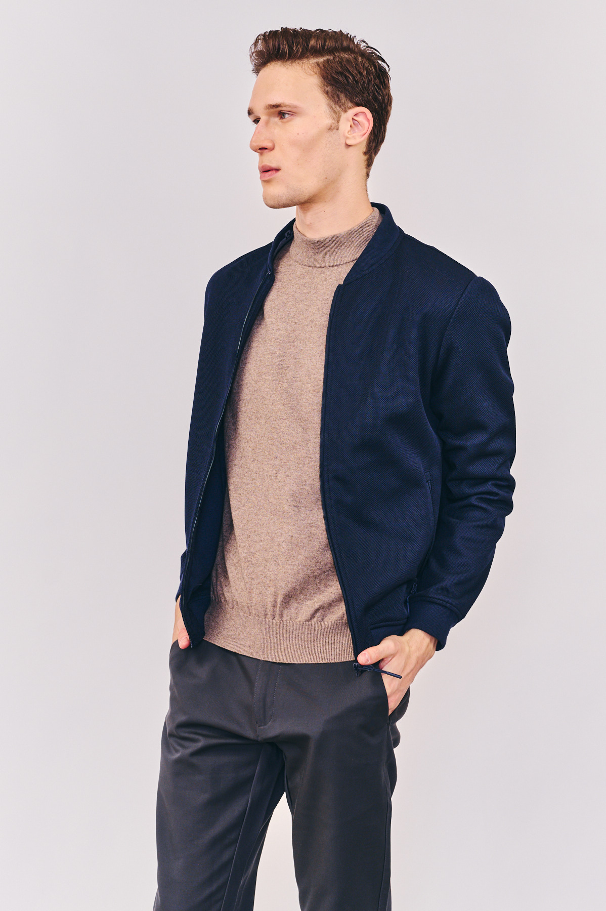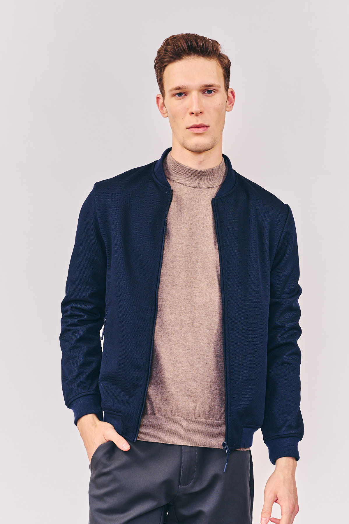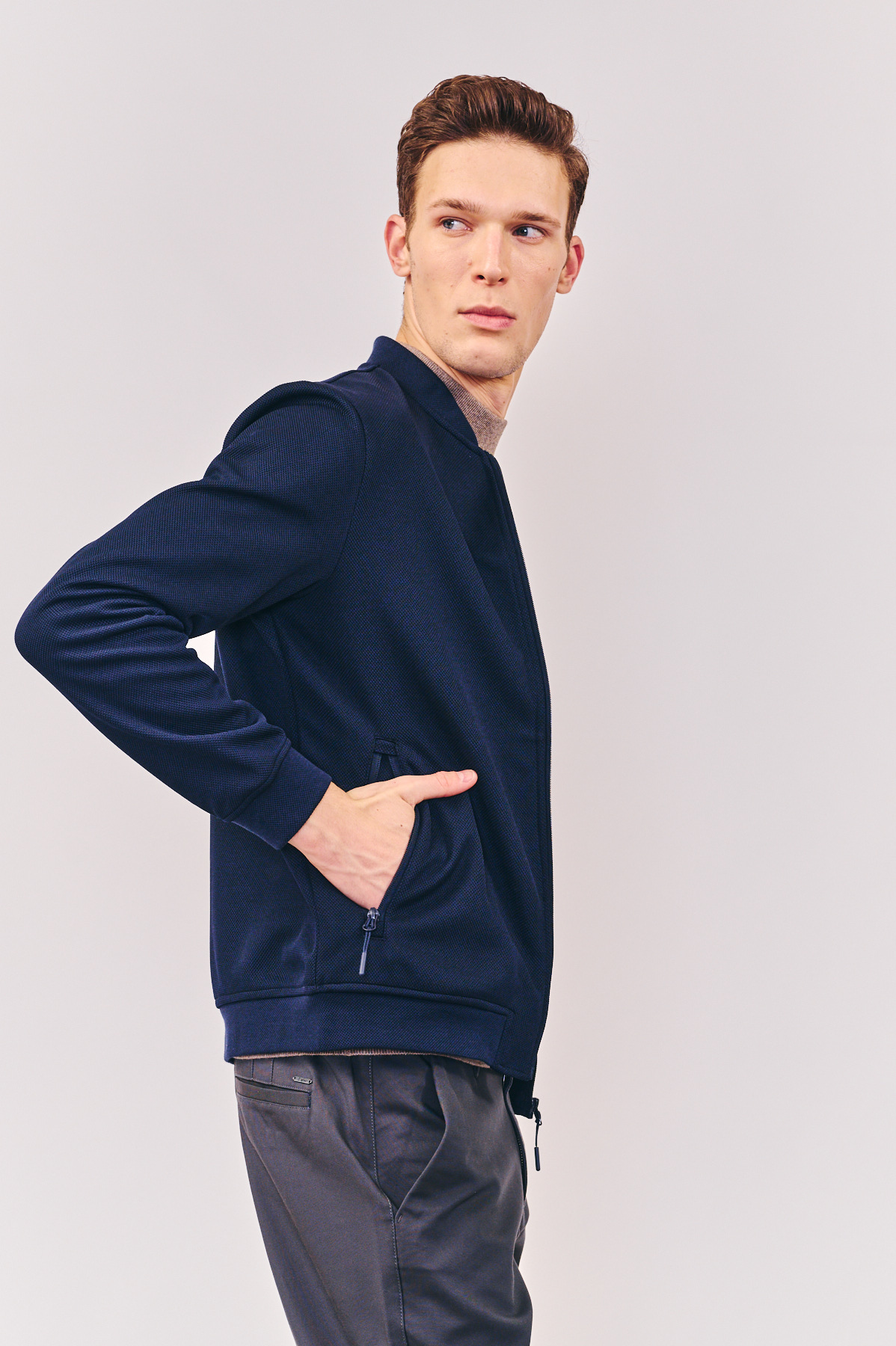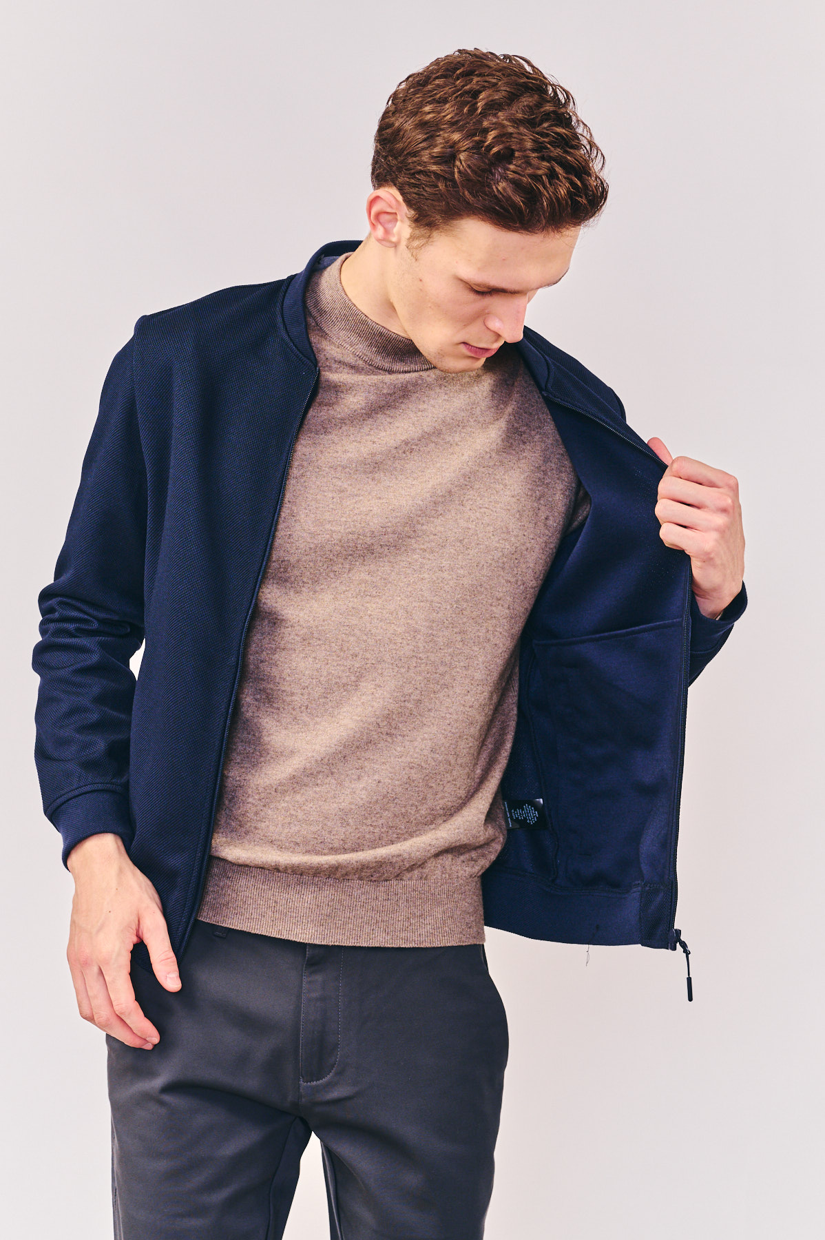 ג’קט קל בצבע נייבי עם רוכסן וכיסי רוכסן, מכפלת ריב אלסטית וצווארון בייסבול ריב נמוך. פנים הג’קט עשוי בד ג’רזי אלסטי לנוחות מירבית