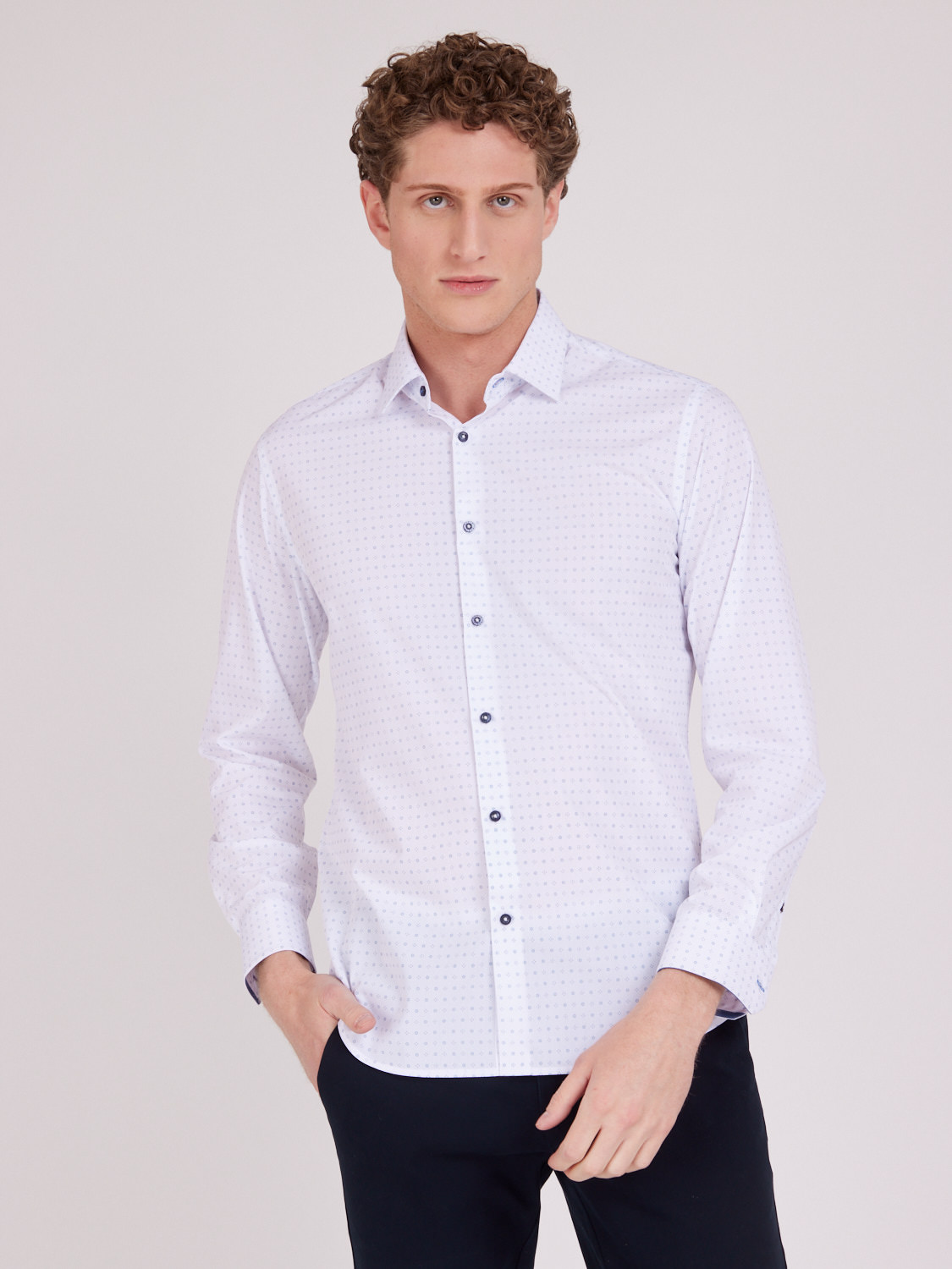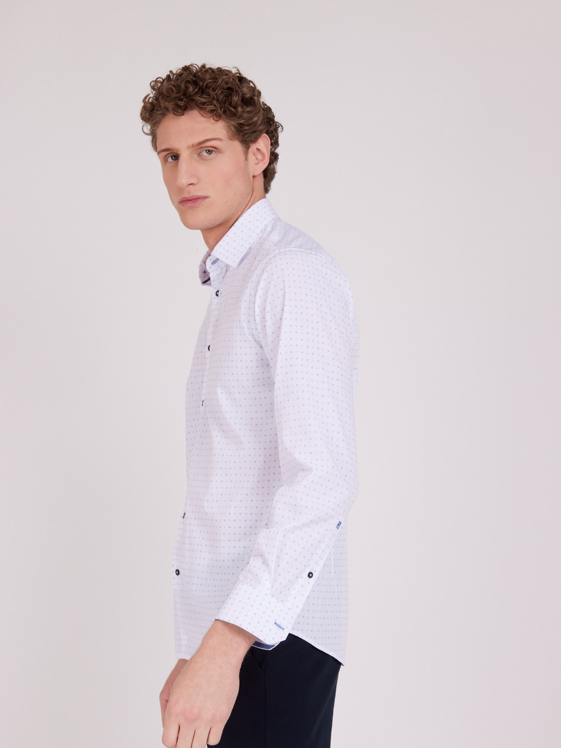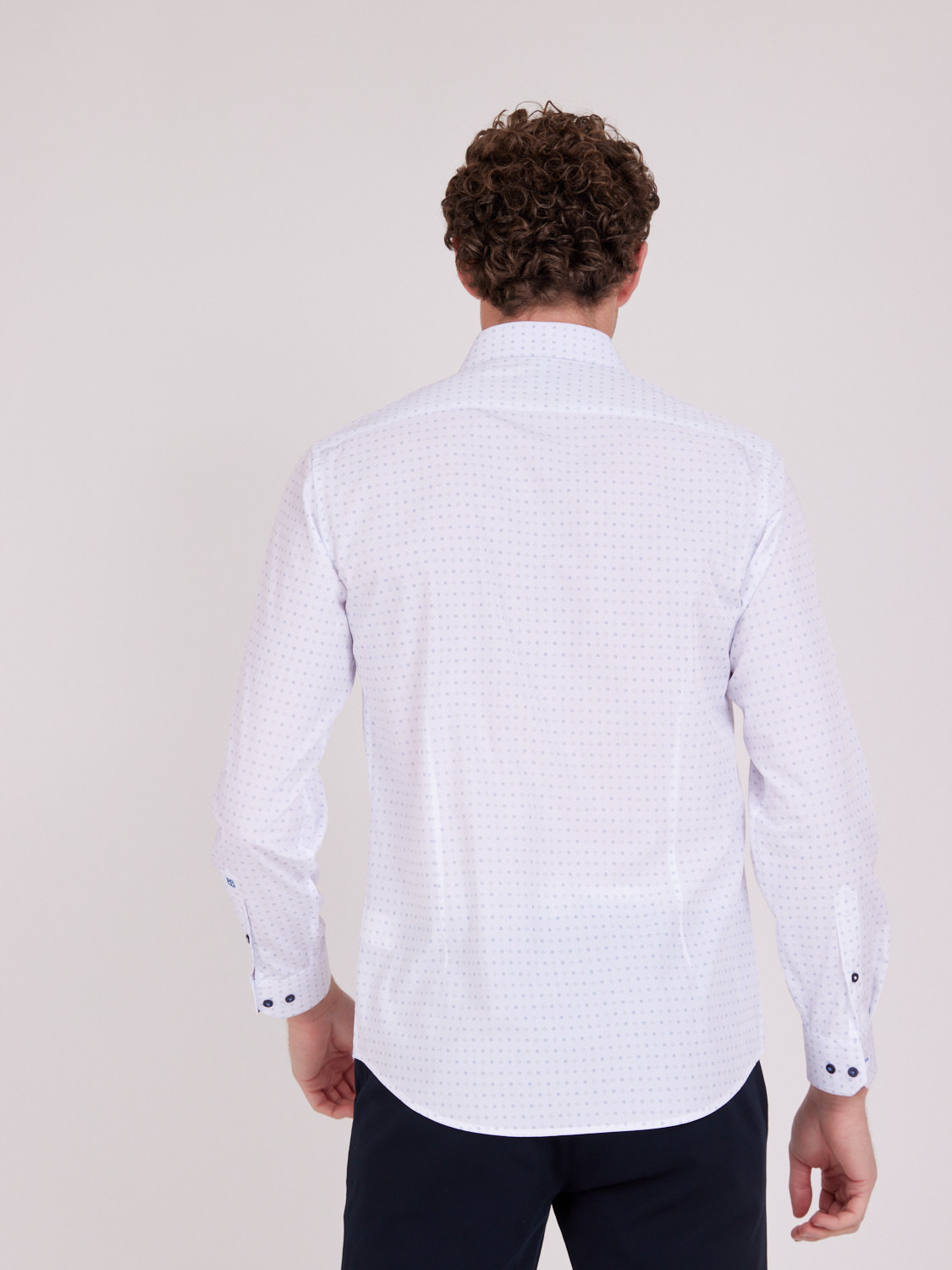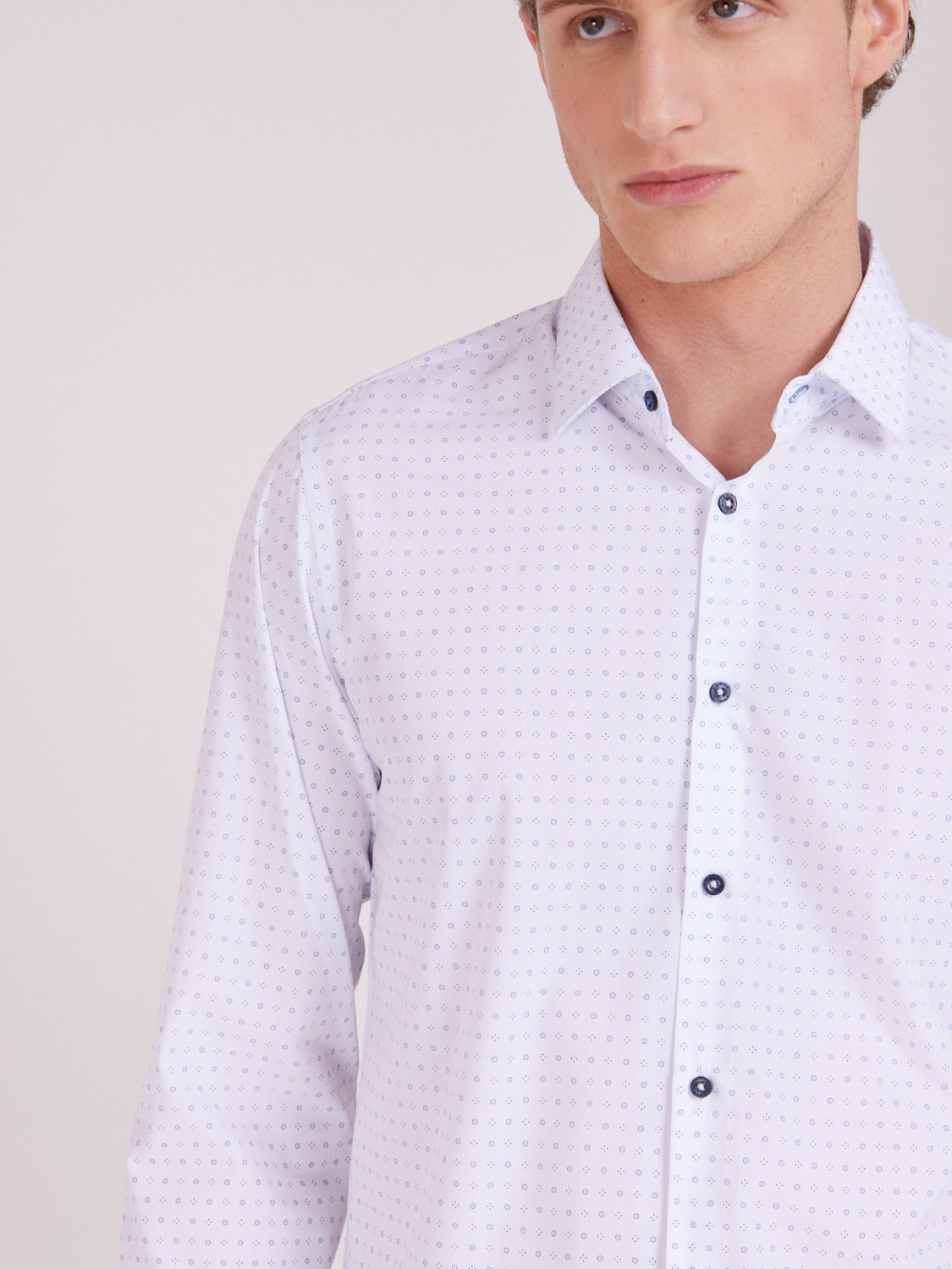 חולצת במבוק מכופתרת לגבר בגזרה צרה [SLIM], שרוול ארוך ללא כיס, בצבע לבן עם עם הדפס עדין בכחול. בעלת מגע אריג נעים ונושם המייחד את אריגי הבמבוק שלנו. מתאים לערב ולמשך היום. הרכב בד: 50% במבוק, 50% פוליאסטר. מידת דוגמן: M גובה 1.80.