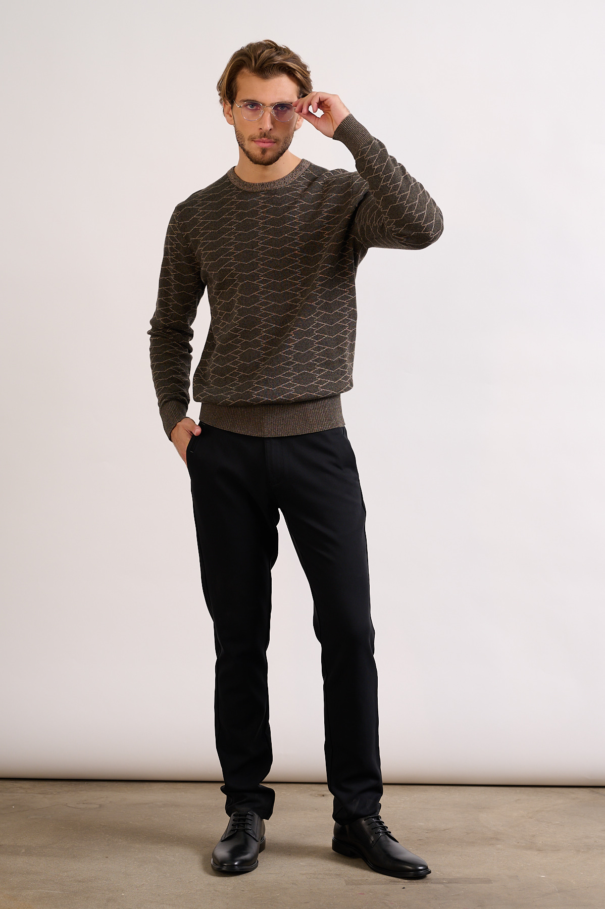מכנסי צ’ינו אופנה בגזרת Slim. באריגת ז’קארד, עם כיסי שפה מאחור. בצבע שחור.הרכב בד: 72% מיקרופייבר, 28% פוליאסטר.מידות דוגמן- גובה: 1.90, לובש מידה 42.”