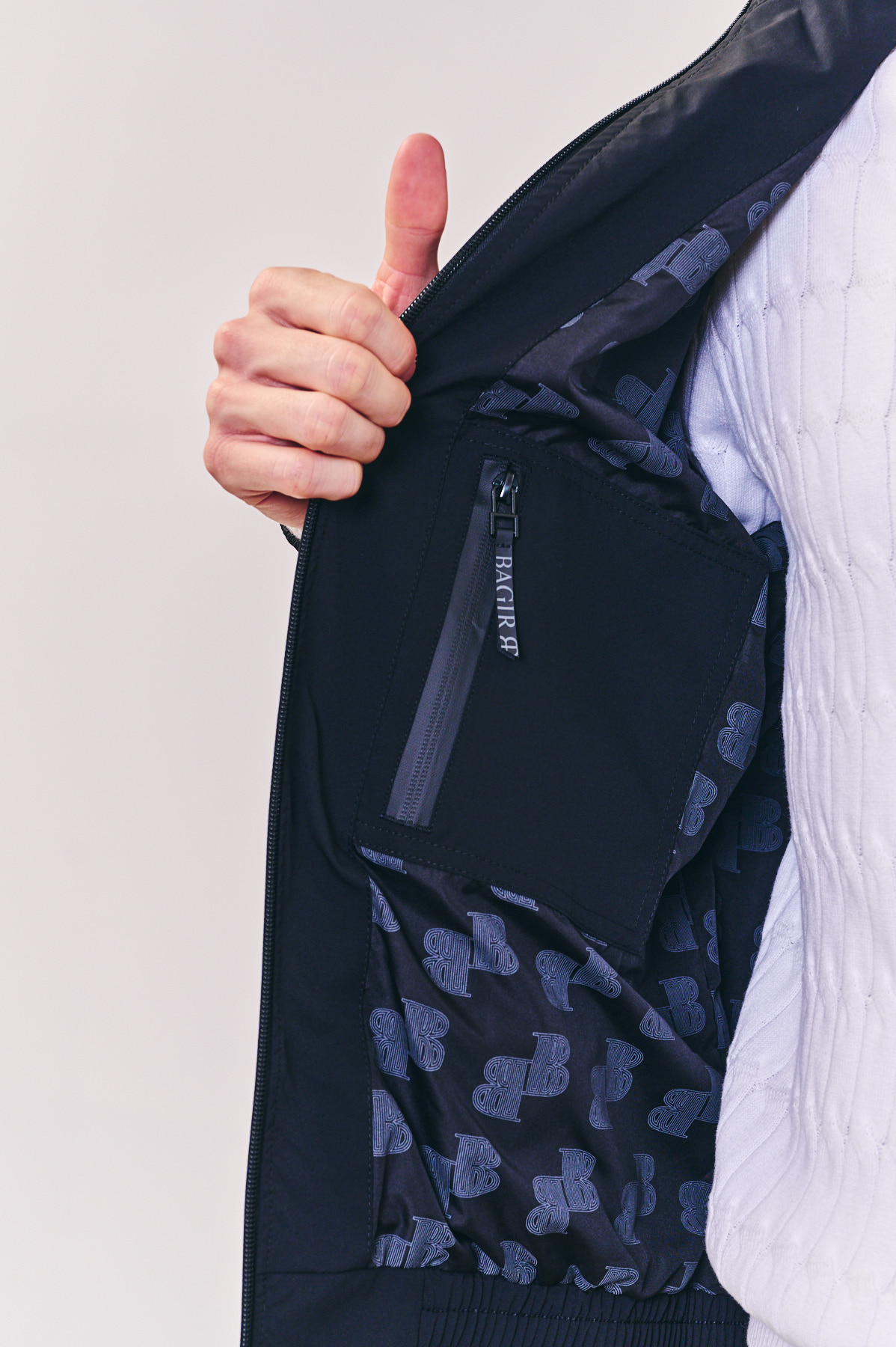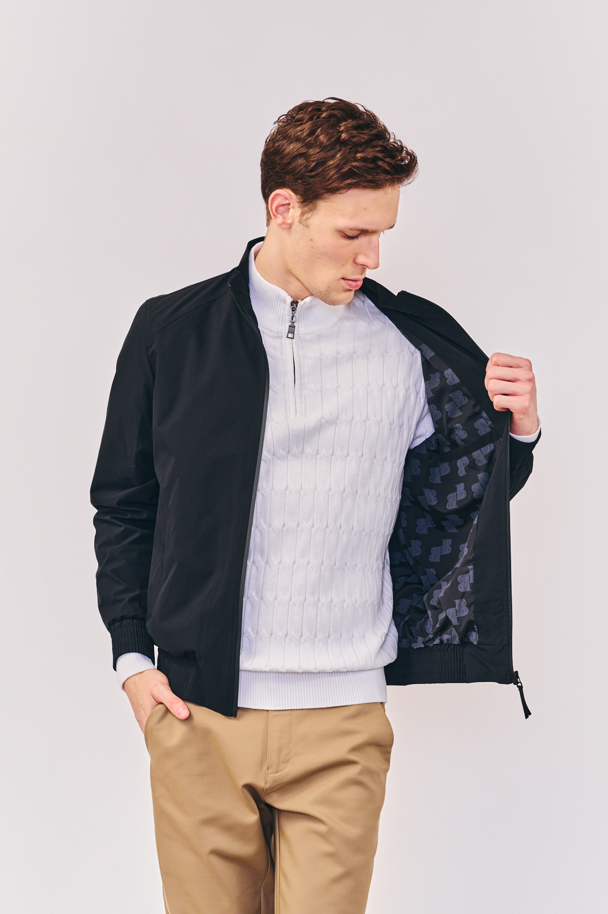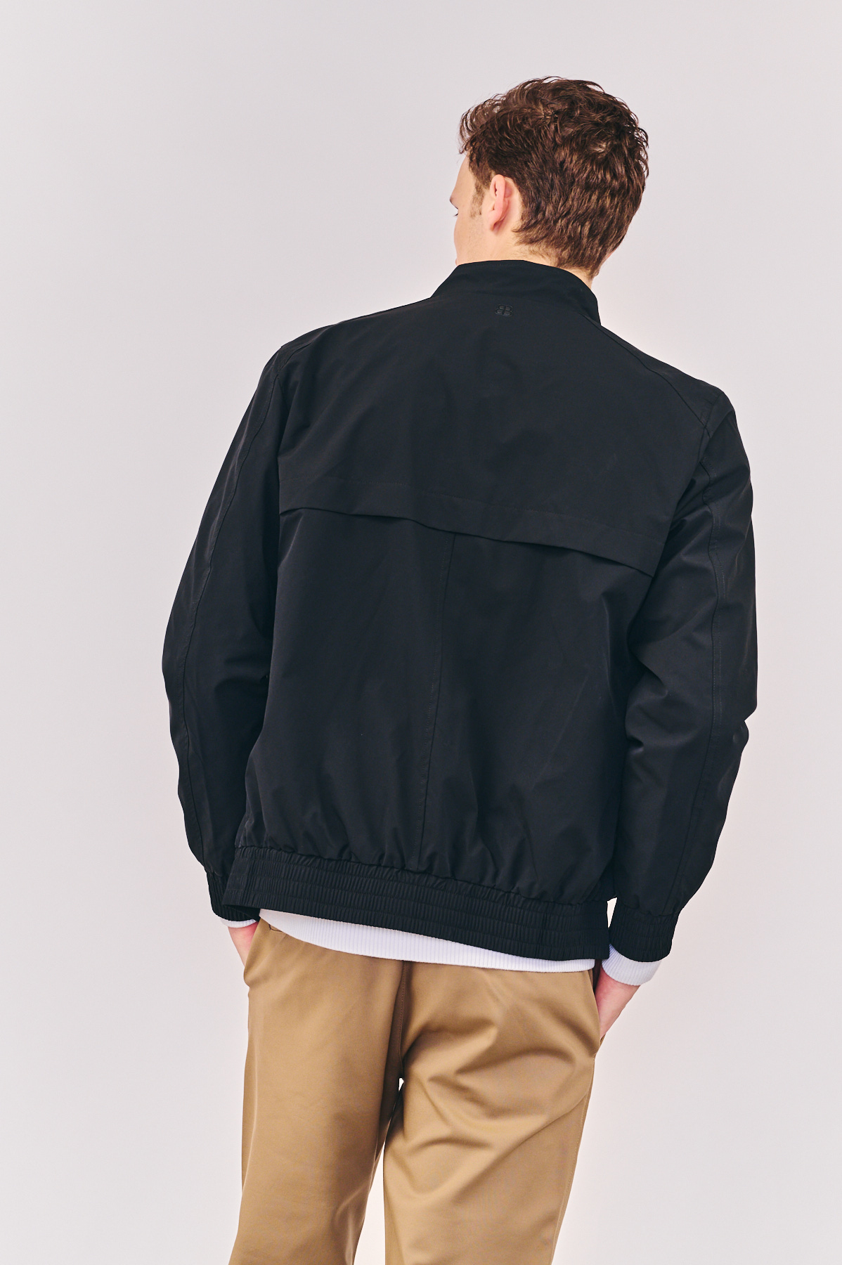 מעיל רוח פונקציונלי עם צווארון גבוה, רוכסן וכיסים ובעל מכפלת אלסטית, בצבע שחור. כולל בטנה עם כיסים פנימיים.