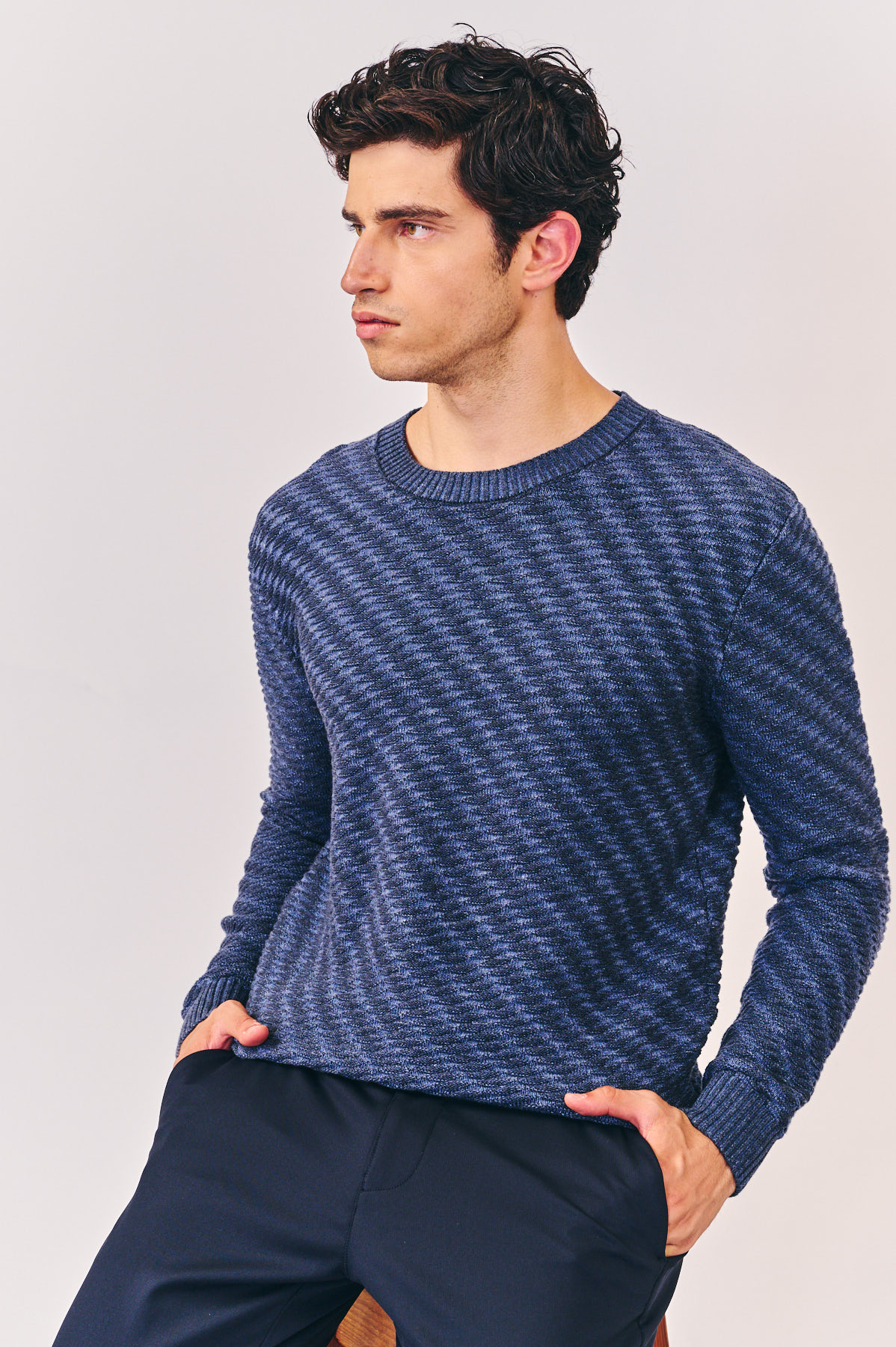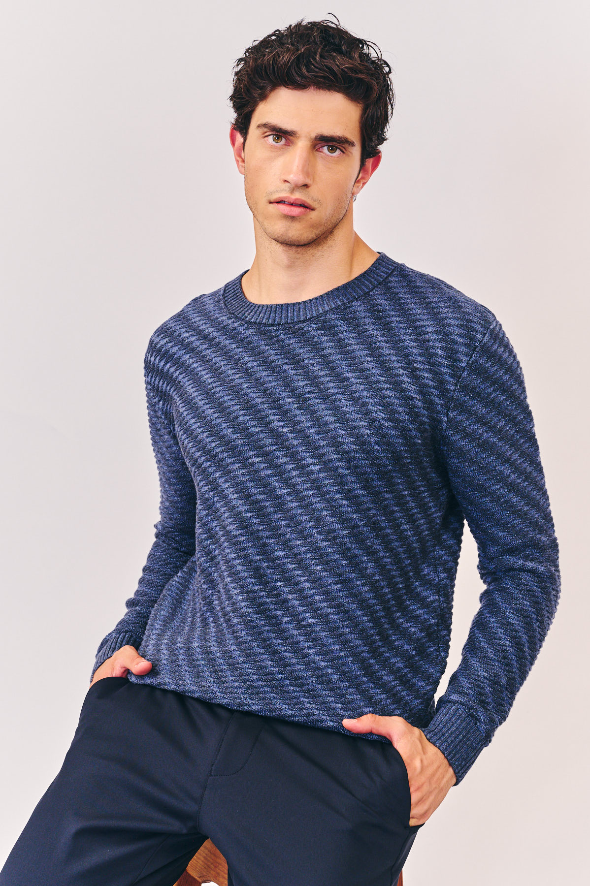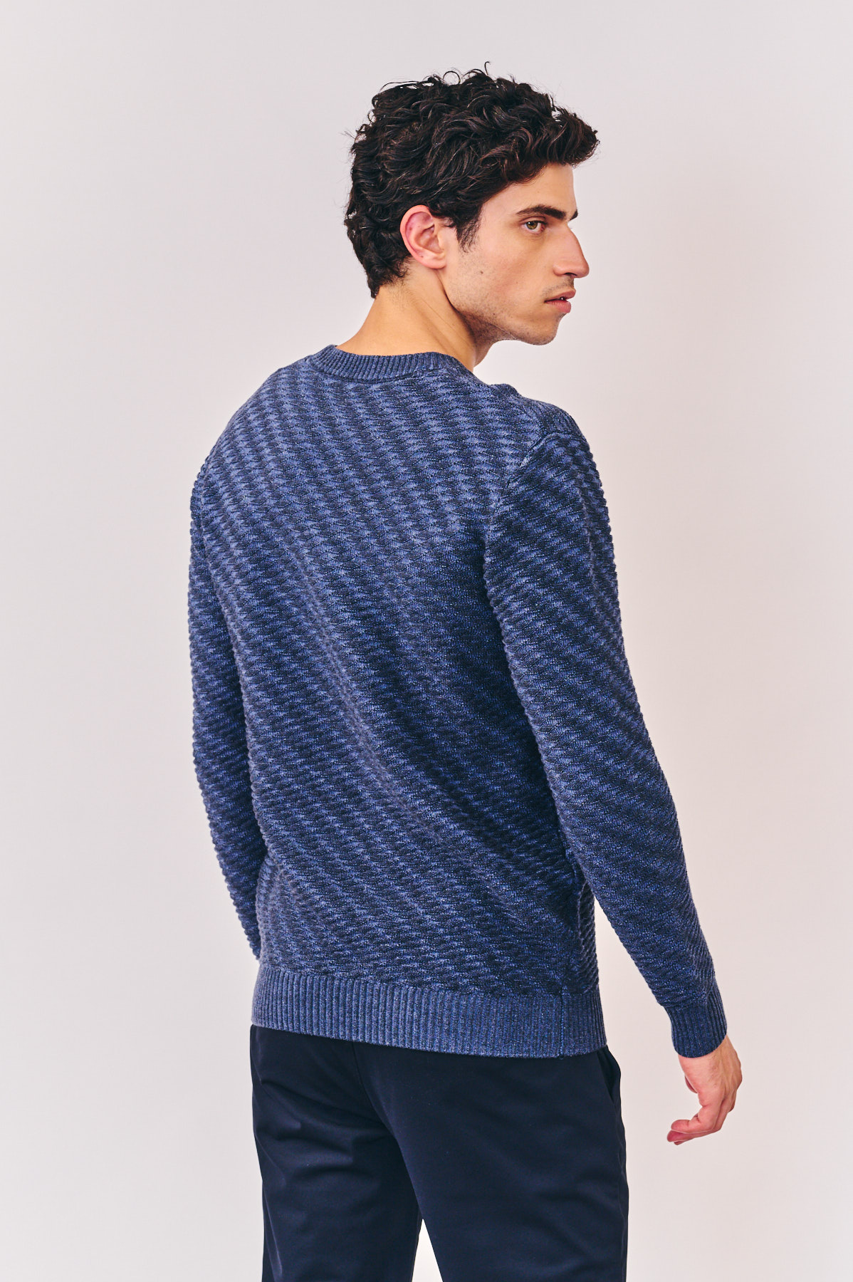 סריג אופנה, צווארון עגול עם דוגמת סריגה מובלטת, בצבע כחול. הרכב בד: 100% כותנה. מידת דוגמן: M גובה 1.80.