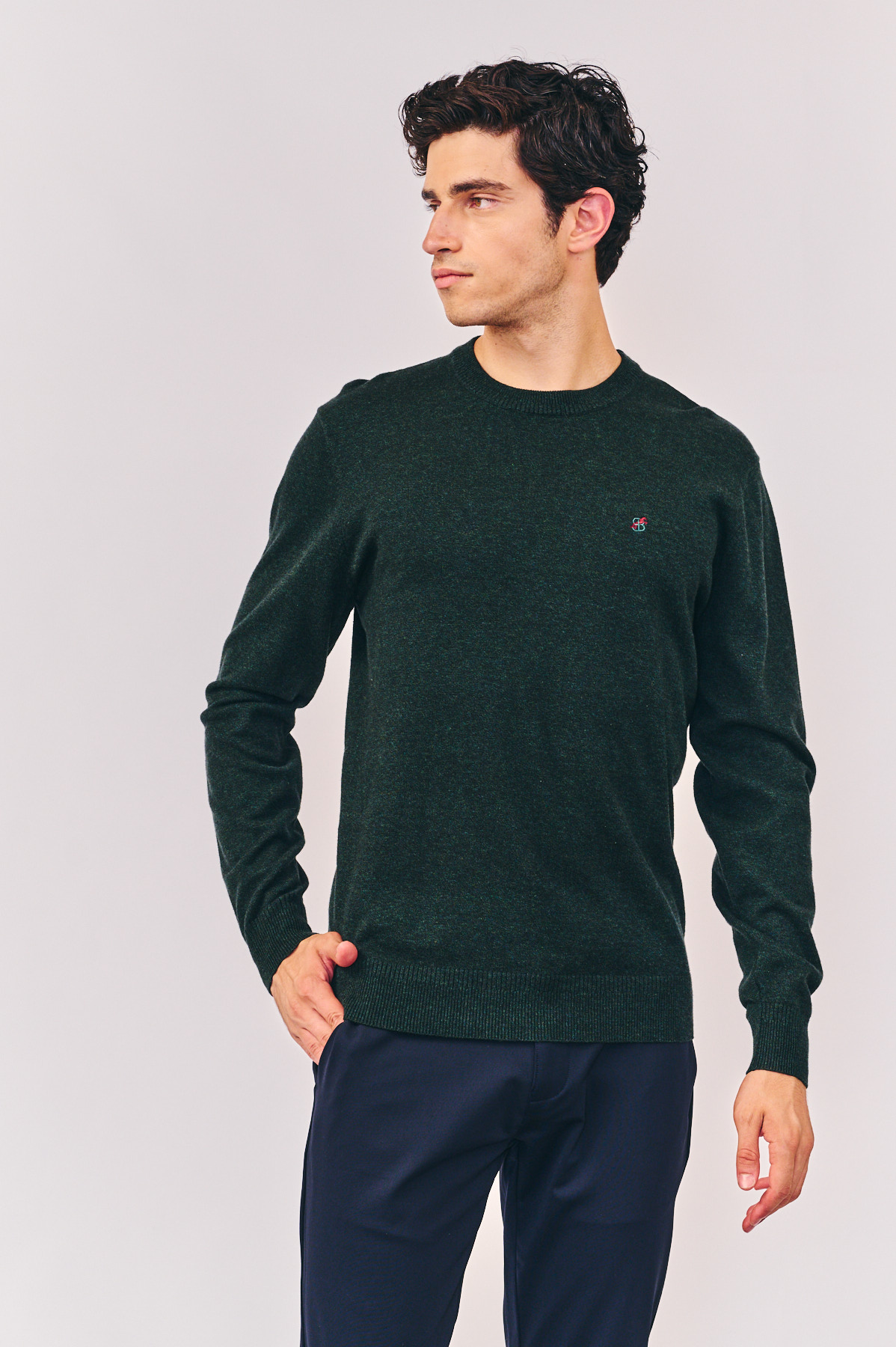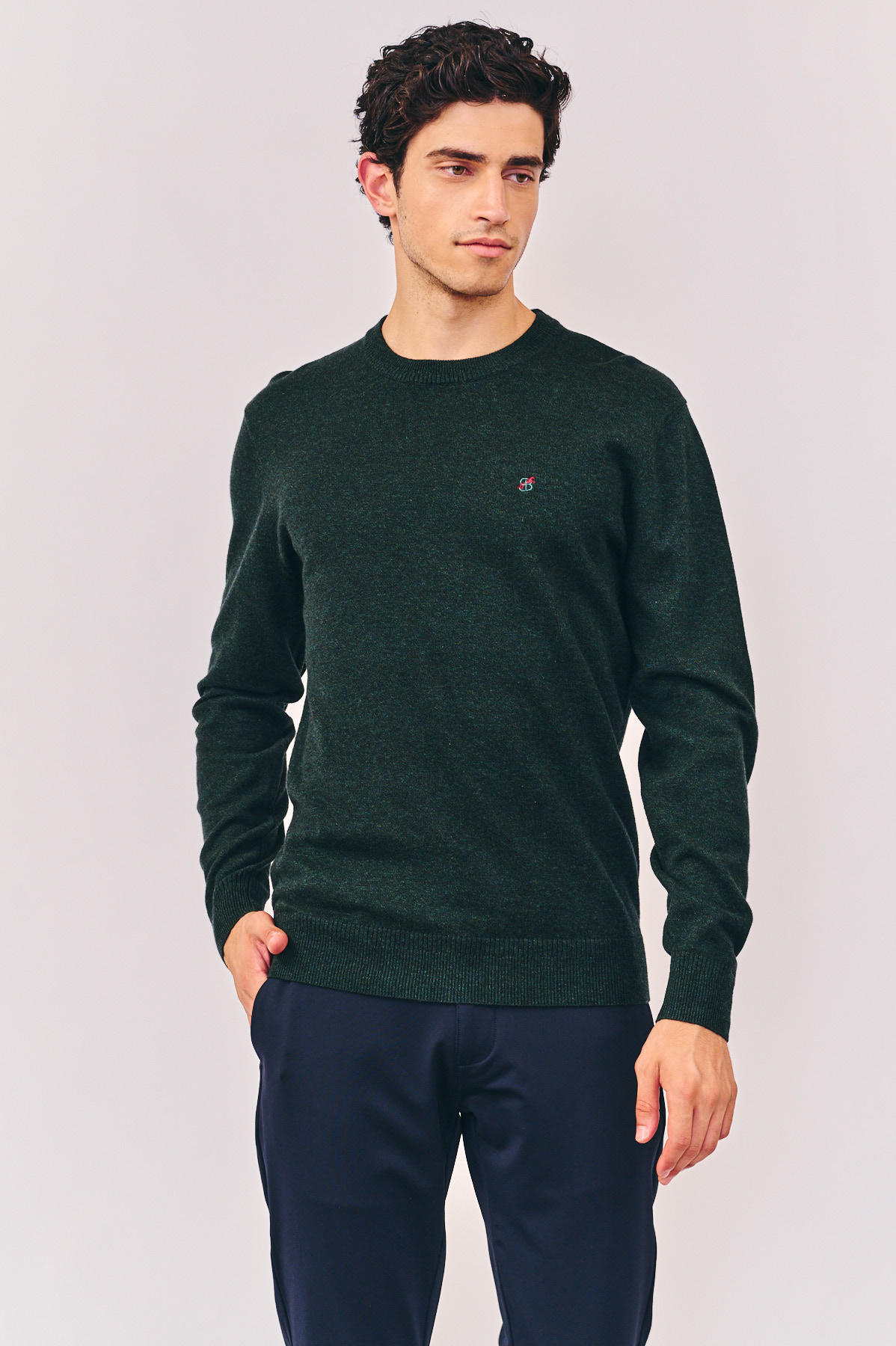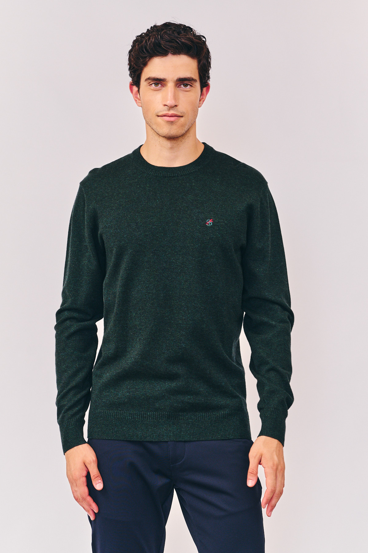 סריג בייסיק חלק, צווארון ניקי (עגול), עם רקמת לוגו צבעוני על החזה, בצבע ירוק. הרכב בד: 100% כותנה. מידת דוגמן: M גובה 1.80.