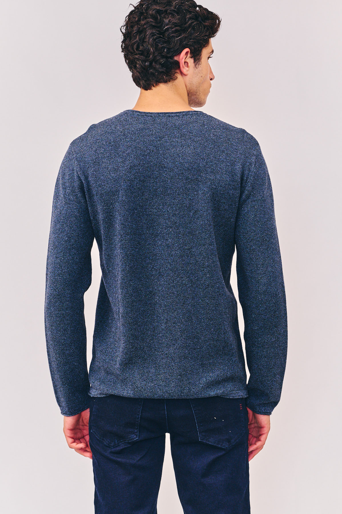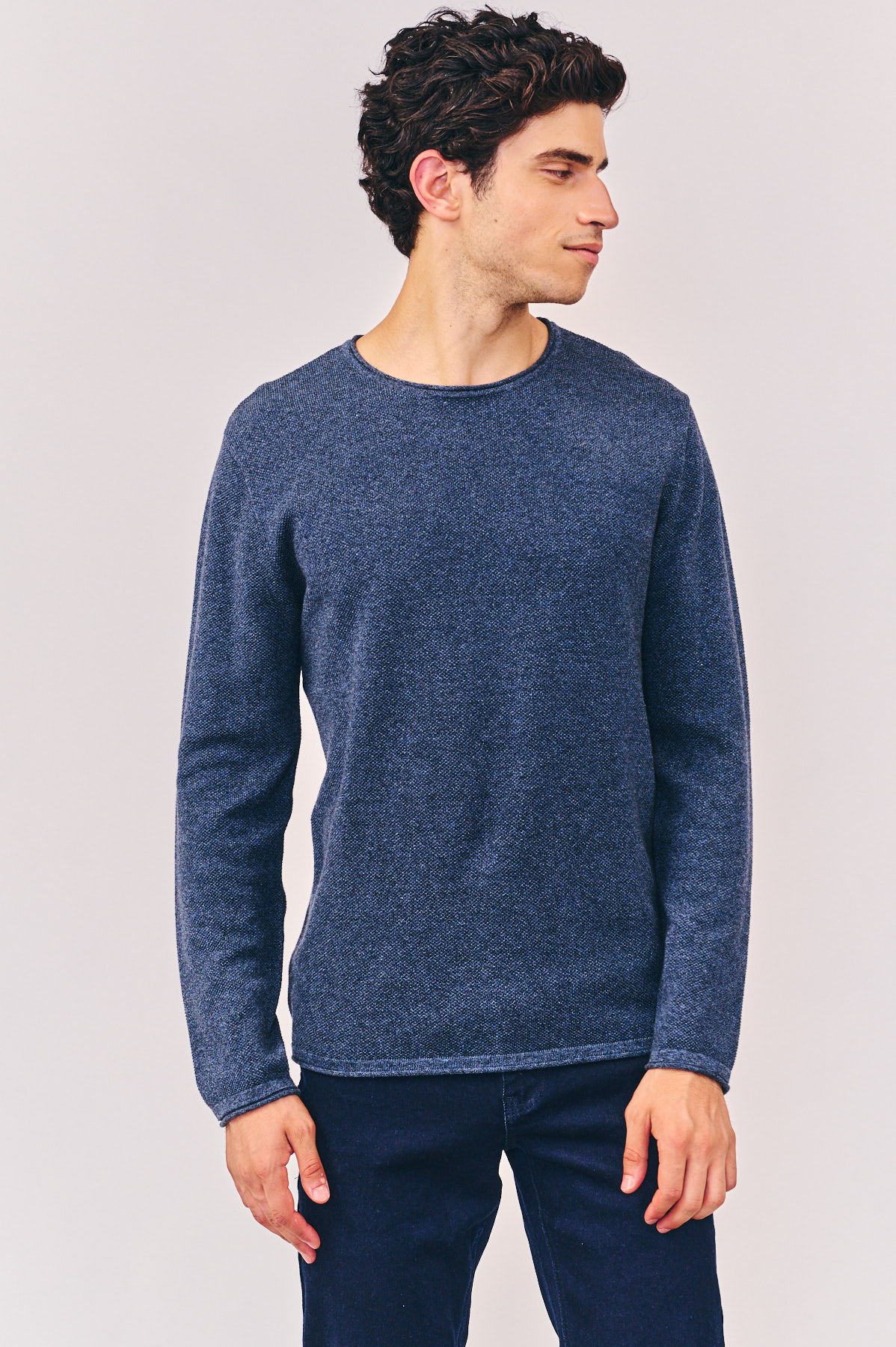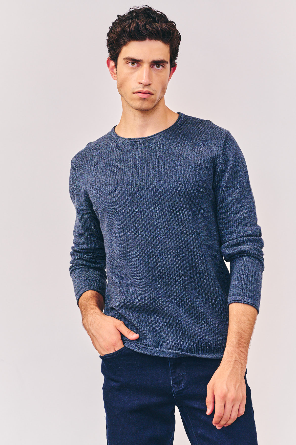 חולצת סריג עם סריגת אורז, צווארון עגול, בצבע פטרול. הרכב בד: 100% כותנה. מידת דוגמן: M גובה 1.80.