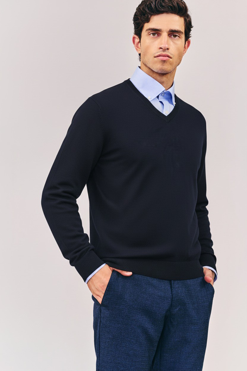 סריג בייסיק חלק, צווארון V, בצבע כחול. הרכב בד: 100% כותנה. מידת דוגמן: M גובה 1.80.