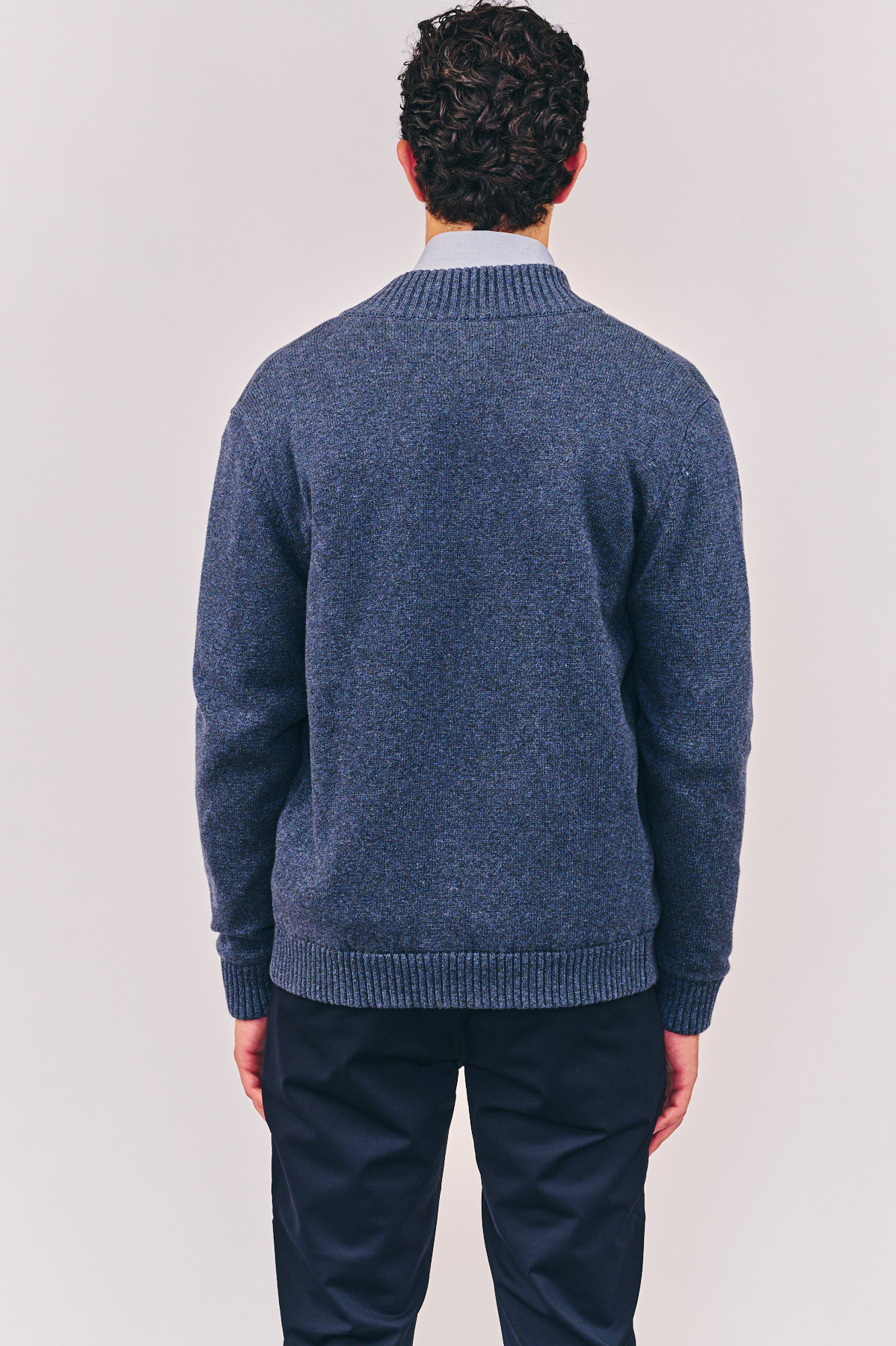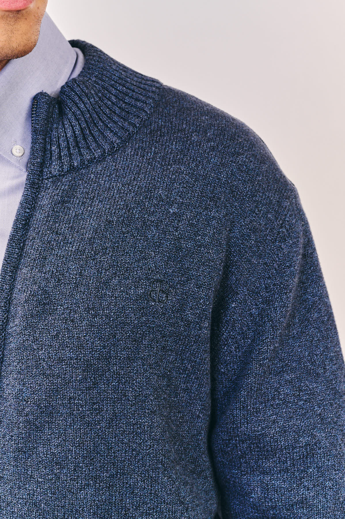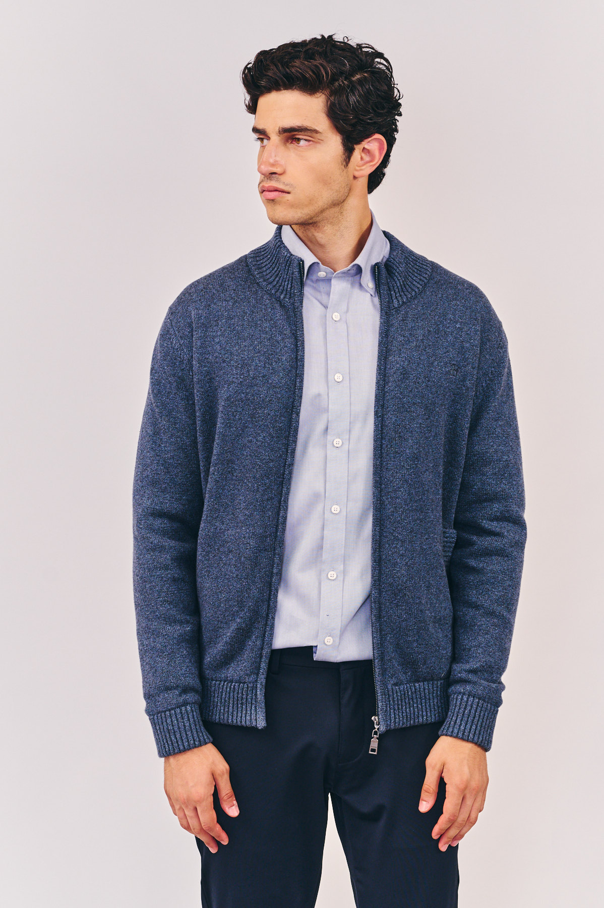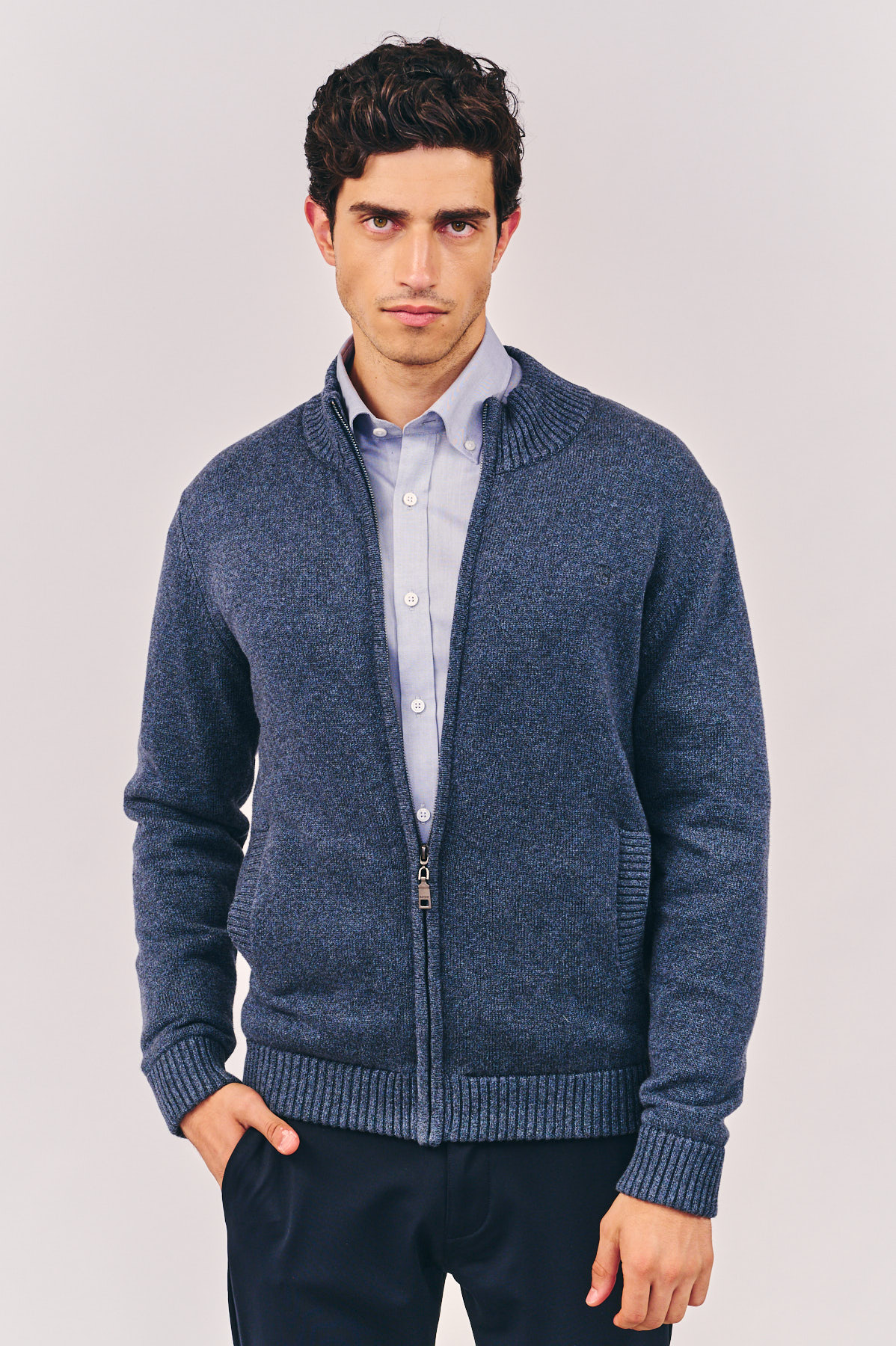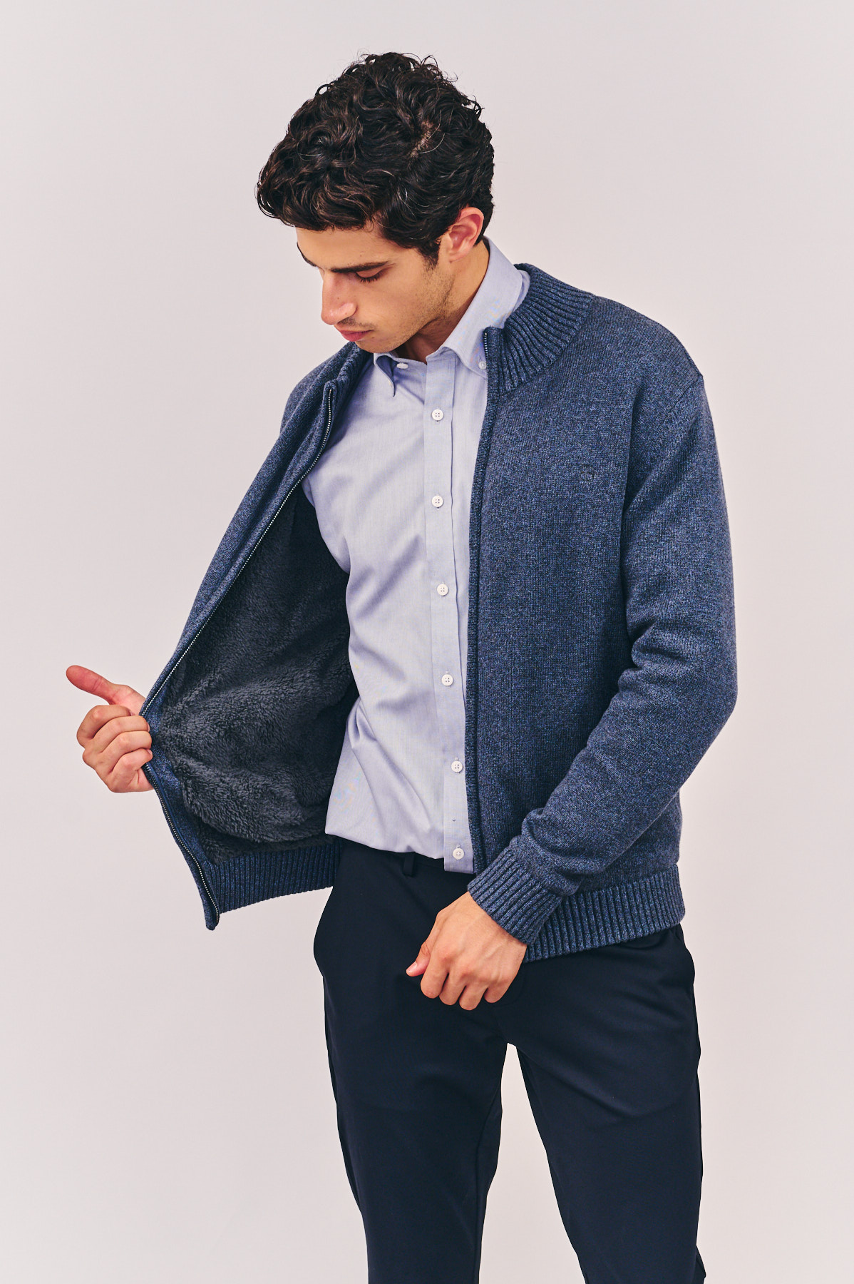 סריג קרדיגן עבה בצבע כחול פטרול. בעל רוכסן מלא, עם כיסים וצווארון גבוה. בטנת “שרפה” (דמוי צמר) סינטטי פנימית. הרכב בד: 100% כותנה, בטנה: 100% אקריליק. מידת דוגמן: M גובה 1.80.